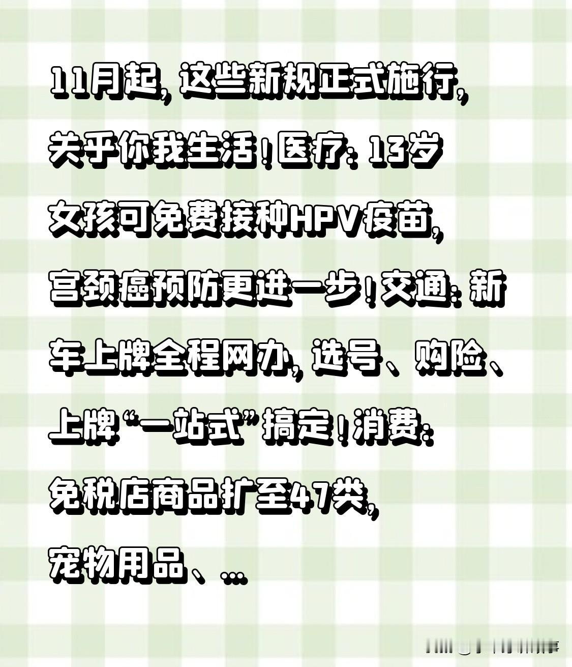 11月起,这些新规正式施行,关乎你我生活! 医疗:13岁女孩可免费接种HPV疫苗,宫颈癌预防更进一步! 交通:新车上牌全程网办,选号、购险、上牌“一站式”搞定! 消费:免税店商品扩至47类,宠物用品、无人机均可购买! 安全:家用应急包强制标准出台,火灾地震逃生必备! 法治:公共场所普及消费维权知识,扫码即可学法律! 政策红利已至,速看并转发,别让身边人错过福利!