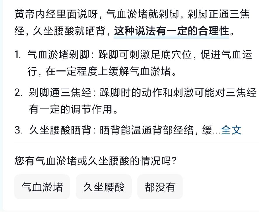 黄帝内经里面说呀,气血淤堵就剁脚,剁脚正通三焦经,久坐腰酸就晒背,背激活阳气生,手脚冰凉就搓耳,搓耳换醒命猛火,头晕脑胀,就握拳,握拳逼退须扶风,夜不能寐,就揉腹,揉腹引气归丹田,肩颈僵硬就望天,望天拉升督脉通,双目干涩就望远,望远重启肝经明,你收藏起来转发给你的家人。