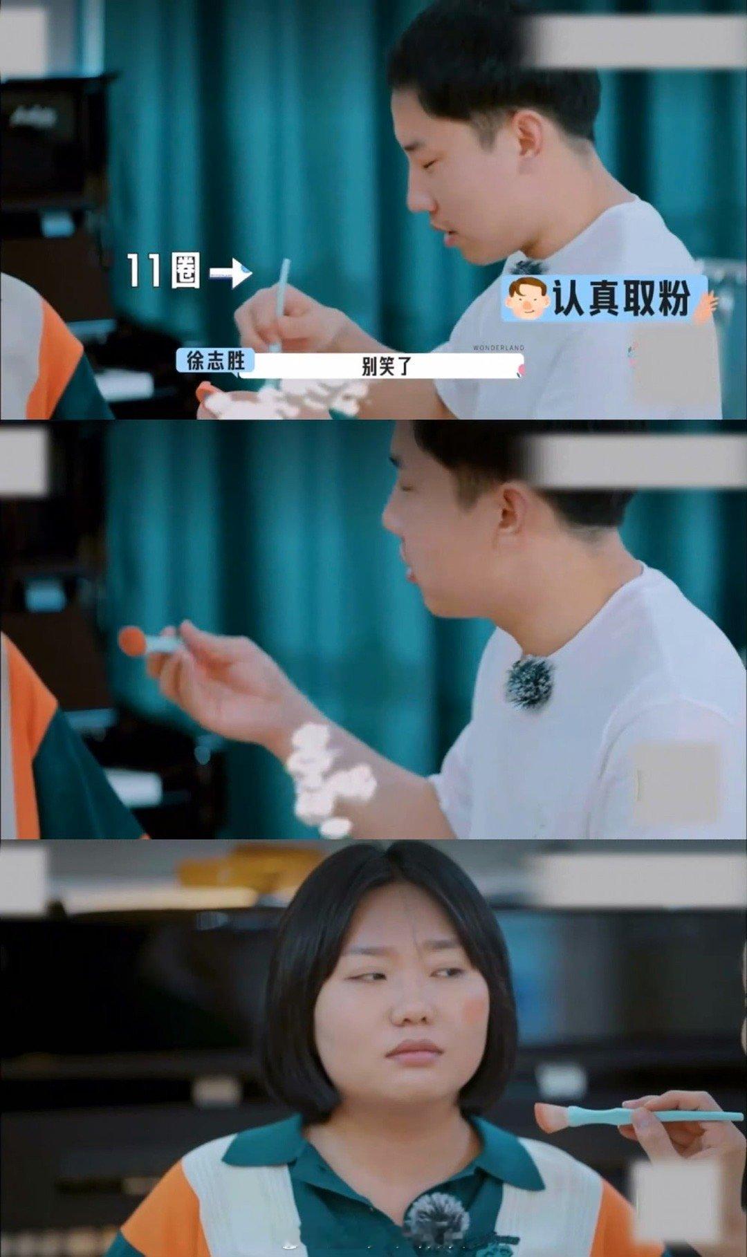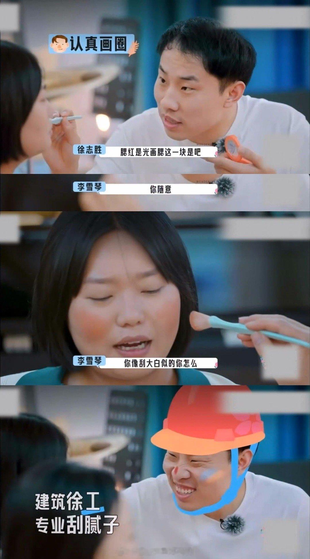 徐志胜复刻给李雪琴画腮红徐志胜在节目里一边开车一边打腮红,手法娴熟得像在画年轮,红扑扑的脸蛋让人一秒梦回他给李雪琴化妆的名场面——时间变了,画法没变,连“年画感”都分毫不差!