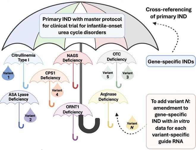 为了在监管上实现突破,CHOP团队借鉴了肿瘤学中成熟的“篮式”与“伞式”临床试验设计。他们计划开创一种“伞式试验”,即在一个统一的“主方案”(MasterProtocol)下,同时招募患有多种不同肝脏遗传病(如尿素循环障碍)的患者。