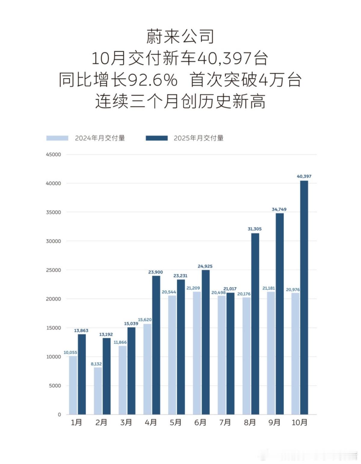 蔚来10月销量40397,同比大增92.6%[赞]ES6今天也30万台了[赞]蔚