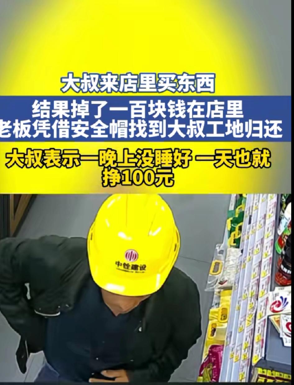 一位农民工大叔去超市买东西 不小心掉了一百元钱在超市里 过后,老板查监控 通过那位大叔戴的安全帽 找到了大叔所在工地 并找到了本人 把钱还了回去 农民工大叔很感谢 称自己丢了钱一晚上没睡好 一天也就百十块钱,丢了一天就白干了 给这个超市老板点赞 不仅找回了钱,大叔心里也不难过自责了[呲牙]