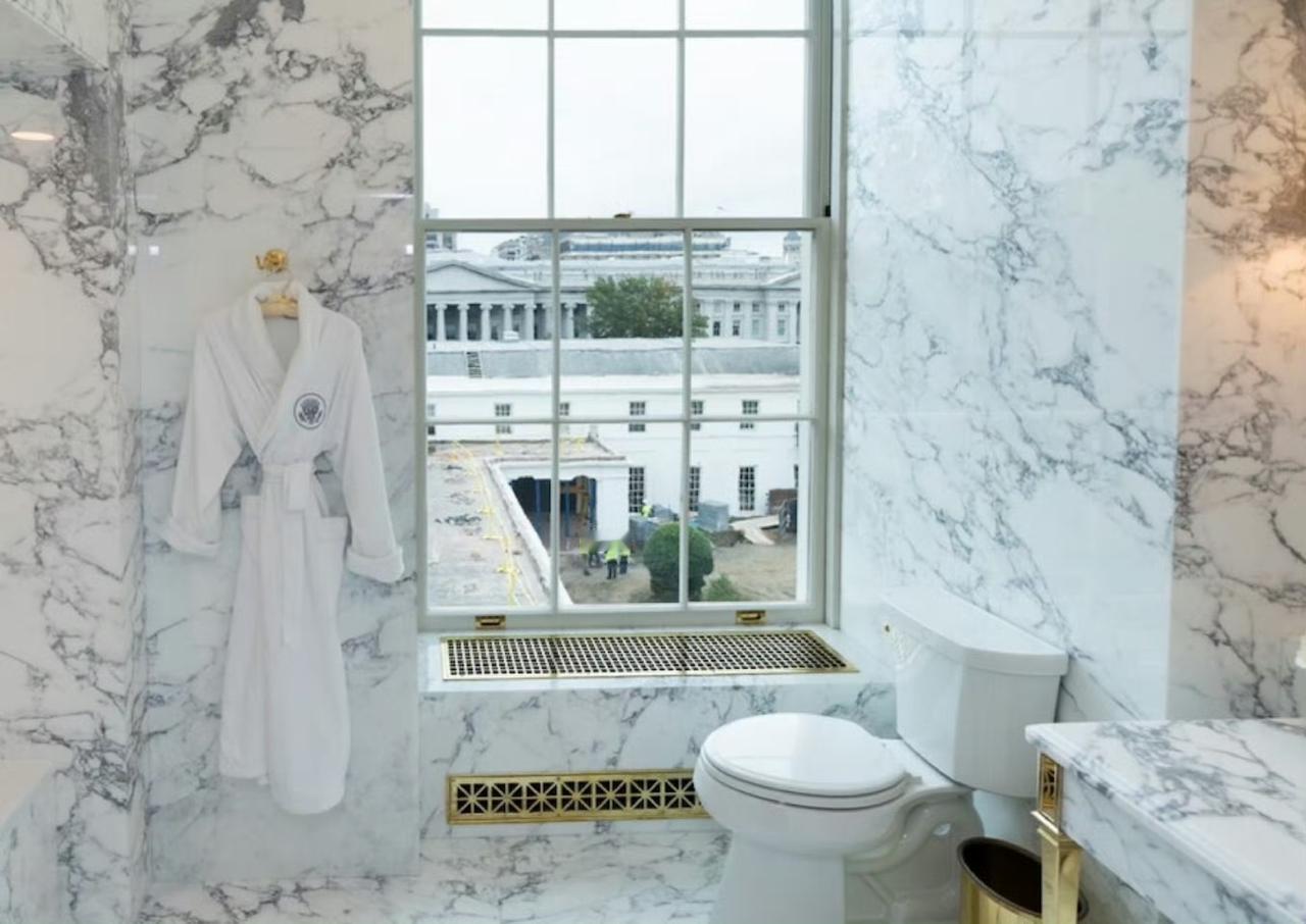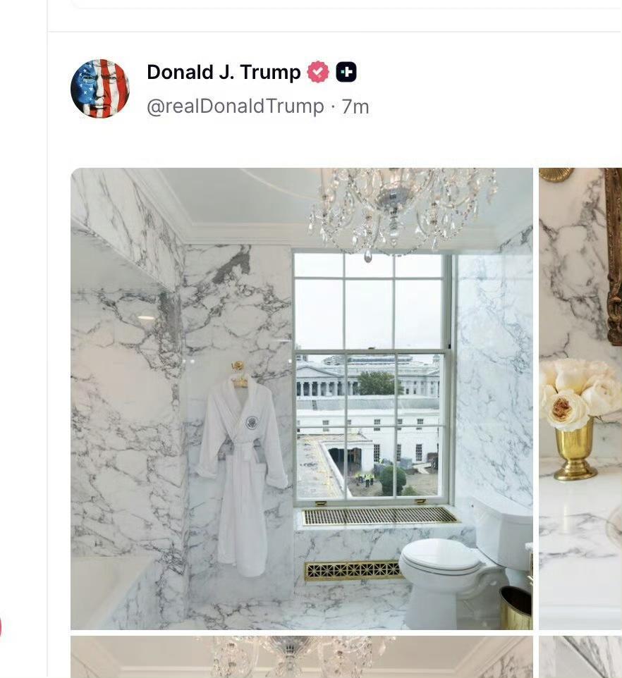 特朗普发布了一张白宫马桶照片,拉屎时可以监督白宫东翼拆除情况。 太离谱了[捂脸][捂脸][捂脸]