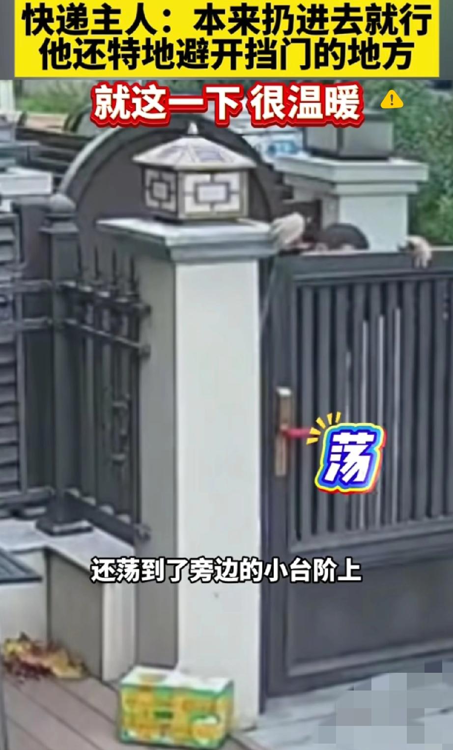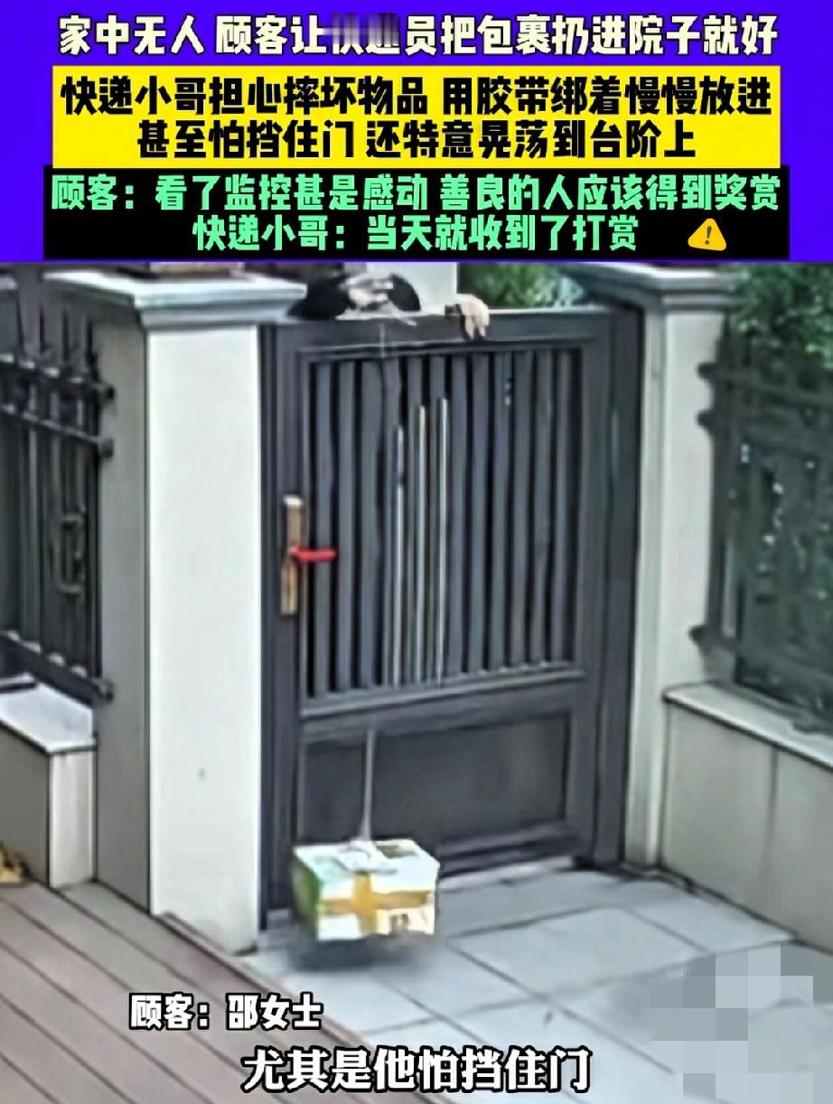 这哪是扔包裹? 天津快递小哥的操作,暖到人心坎里! 刷到天津这位快递小哥的视频,真的被戳中了! 顾客说家里没人,让他把包裹扔院子里就行,换别人可能真就随手一抛。 可他倒好,找了根绳子把包裹捆住,小心翼翼吊进院子里,最后还轻轻甩到大门内侧,生怕摔坏了东西。 监控拍得清清楚楚,这哪是“扔”,明明是藏在细节里的责任心。 现在总有人说工作忙起来顾不上细节,可这位小哥用行动证明,认真从不是麻烦事。 一份职业的体面,从来不是靠职位高低,而是把别人的小事放在心上的真诚。 这种藏在日常里的温暖,才最能打动人心。 你在生活中遇到过这样暖心的陌生人吗?快来讲讲你的经历!