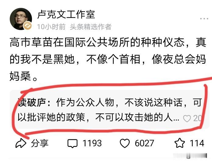 看看吧!一个百万粉丝大v对一个女人进行人身攻击,还得到了无数网友的点赞,这个大v就是卢克文,他说高市早苗像夜总会的妈妈桑,对此,我们先不说高市早苗是首相,还是什么职务,她首先是一个女人,靠侮辱一个女人获得流量的大v,不应该是一个男人所为,这个太不体面了,也拉低层次,不建议平台给这种帖子流量,也容易拉低平台的层次………