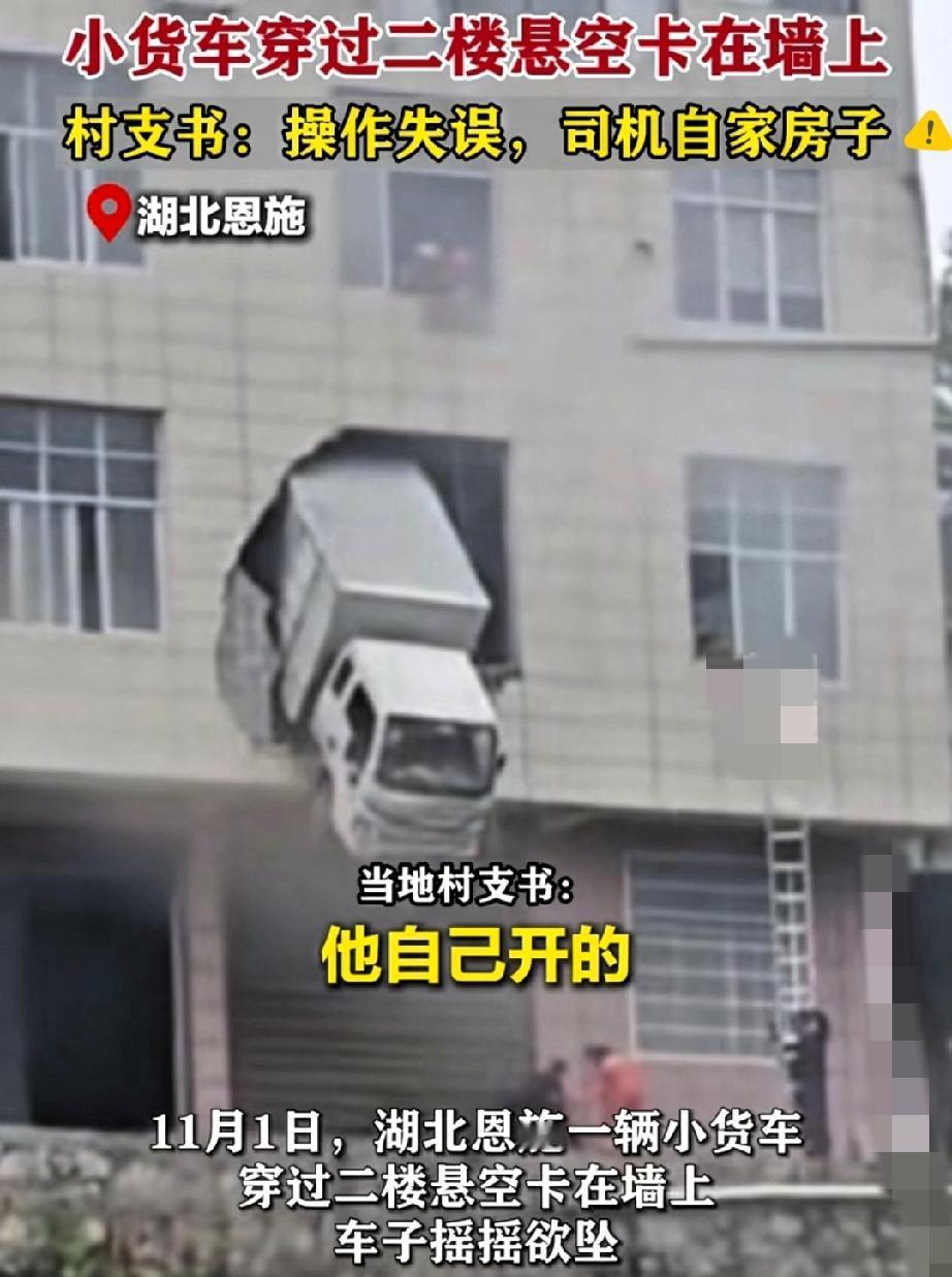 这操作也太“离谱”了! 小货车直接穿进二楼墙体,悬空卡在楼外面—— 你敢信这是自家车撞了自家房? 村支书说就是操作失误闹的,好在没人受伤。 看着这货车卡墙的画面,真觉得“小心驶得万年船”不是空话,哪怕是自家地盘、自家东西,操作时也不能掉以轻心。 很多意外就是因为“都是自己的”就放松了警惕,可安全这事儿不分“你的我的”,哪怕再熟悉的工具、再熟悉的环境,多一分谨慎才能少一分麻烦。 你生活里遇过这种“大意出乌龙”的事儿吗?评论区聊聊你见过的离谱操作!