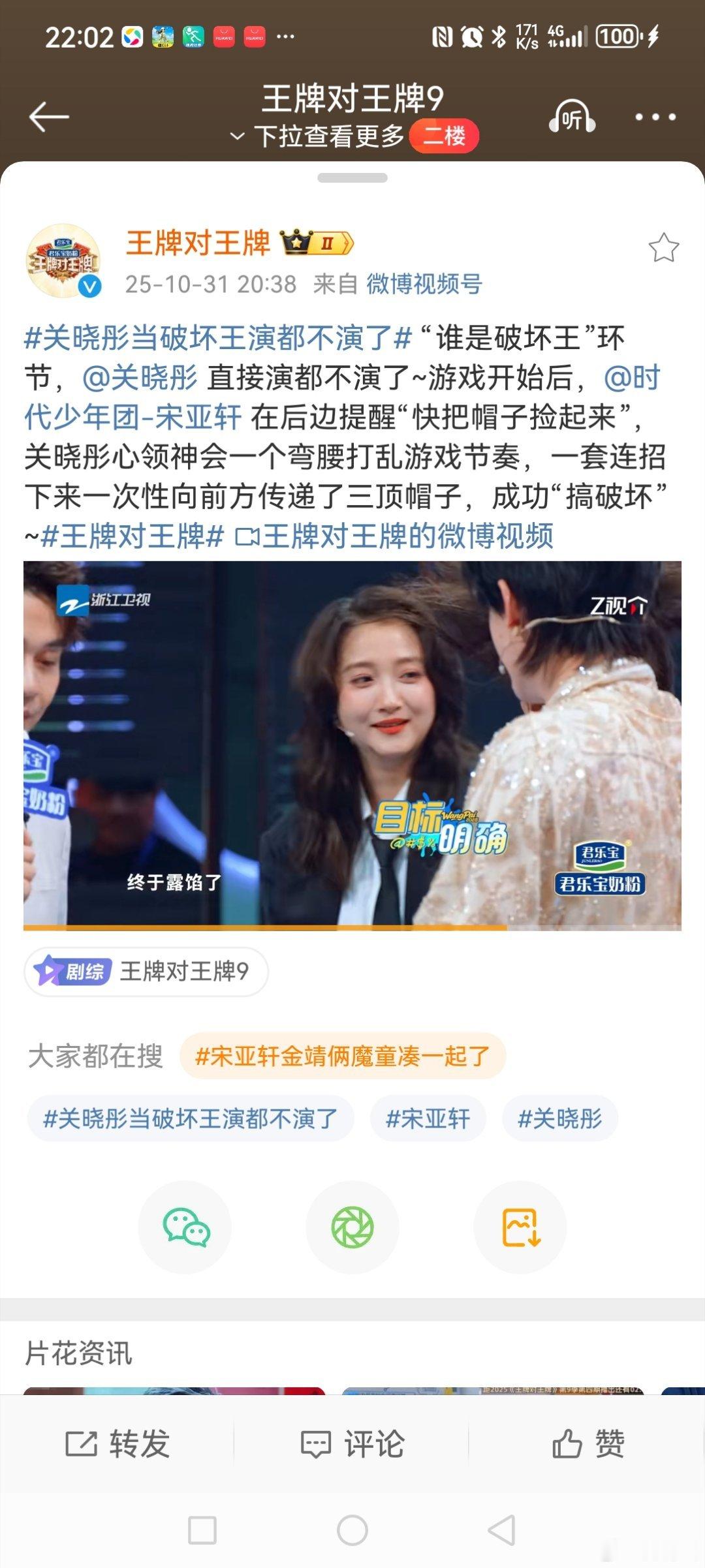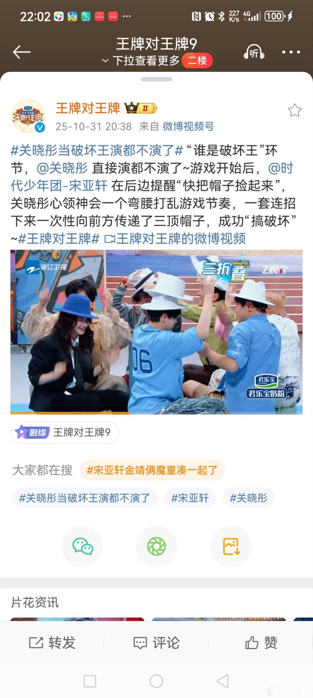 在节目的“谁是破坏王”转圈换帽子🎩环节中,因为搭档的动作幅度较大,把的发型弄得凌乱了,晓彤调侃自己“我感觉我掉了好多头发啊!”