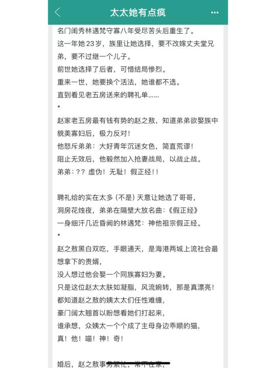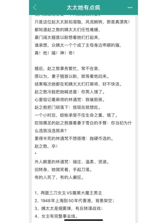 《太太她有点疯[搜索高亮]》,作者:四单铺 主角:林遇梵,赵之敖 *两面三刀女主 x 腹黑大魔王男主 *民国/重生/甜文/爽文/年代文/先婚后爱 小说推文 小说 重生 重生文 先婚后爱 年代文