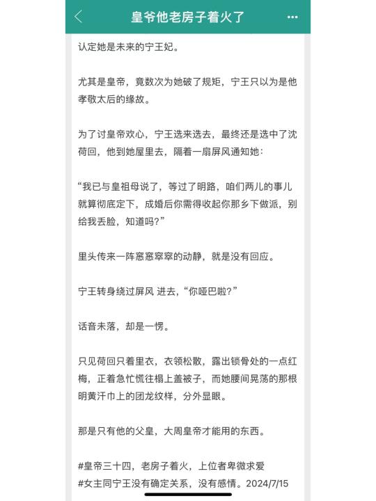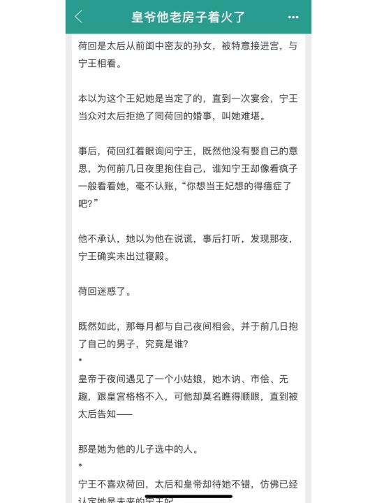 跟男主相遇的时候是晚上,女主并不知道男主是谁,只知道这个人救了自己一次。后来两人又机缘巧合相遇过几次,男主以为女主是秀女,女主因为夜盲症,把男主误认为是宁王,还吐槽宁王不是好人明明有喜欢的人,还能接受自己的示好。后来男主先知道了女主的身份,此时的男主想要远离,但没想到老房子着火,感情来的太凶猛了,根本无法克制。故事还在连载,之后的发展如何尚不明朗。