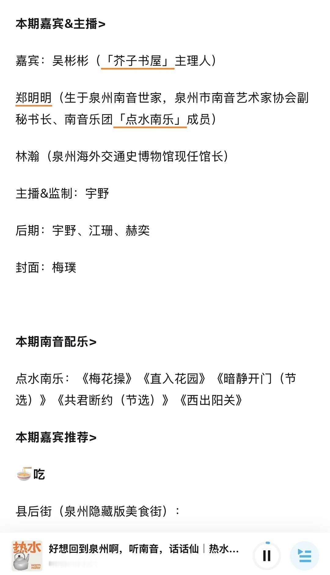 作为一个资深金鱼脑…… 我这种金鱼般记忆的人,时常看什么都有“常看常新”的滋味。 9月份参与了@about编辑部 的企划,带着「about热水频道」的朋友逛泉州,其实也有一种打开自己,了解自己的感觉。 和宇野一起探索泉州,一起观察我生活的城市,唤起了我久远的记忆,也找到了很多新鲜视角。 听到成片,特别保留了非常生活化的背景环境音,或许能让你更沉浸地加入我们的citywalk ?一起来「逛」「听」呀~ 🎧【关于我的show notes】 46:25 在南音中长大,是一种什么体验? 50:00 南音乐队里,最靠谱的人才能当琵琶手? 53:40 戳这里,听听南音四大件~🎵 58:58 有闽南人的地方就有南音 01:02:34 没听过南音?先听这几首,包入坑的 01:08:51 在西街偶遇音乐制作人,从此南音有了新声音 01:10:15 「希望我的学生们想起南音的回忆里,都有爱」 👩🏼🤝👩🏻【我们的路线】 天后宫➡️聚宝街➡️南音社 🎵【节目中的南音配乐】 @点水南乐 《梅花操》 《直入花园》 《暗静开门(节选)》 《共君断约(节选)》 《西出阳关》 about关于 about热水频道 正是明明 不是暗暗 泉州 播客 播客推荐