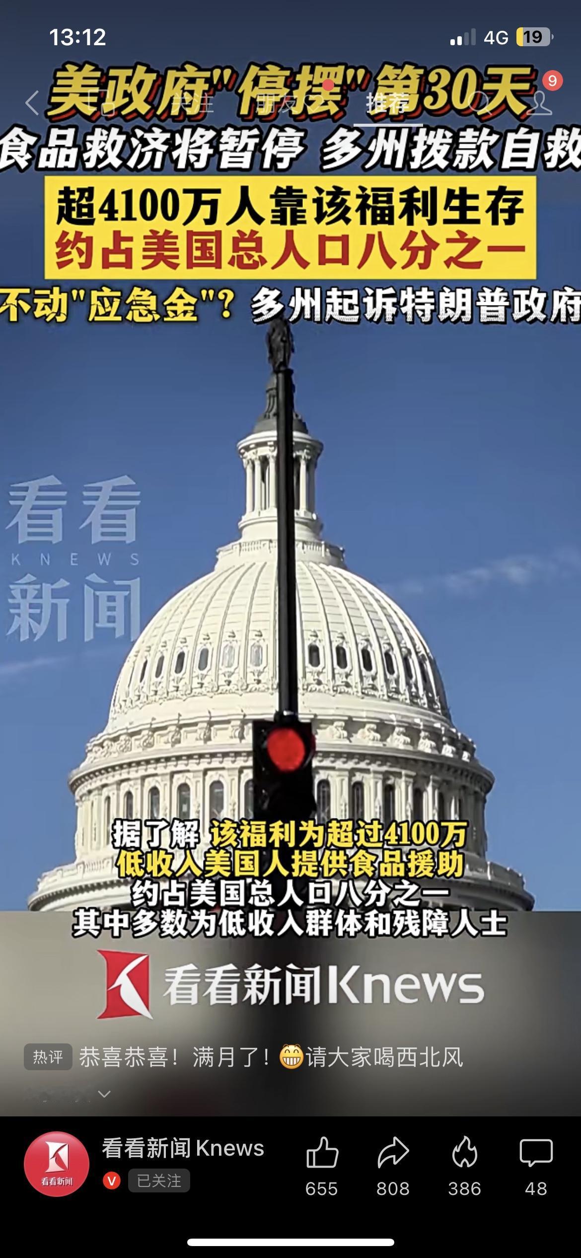 美政府摆烂30天!4100万人要饿肚子 刚刷到这事儿直接懵了!美国政府停摆整整30天,11月1日起食品救济就停了——超4100万人靠这活,是八分之一的美国人啊! 内容:这4100万全是穷人、残障人士,现在纽约州急得砸6500万自救,还把政府告了…合着这“超级大国”连老百姓吃饭都不管了? 美政府停摆 这操作看得人血压都高了,快转给身边人,看看这闹剧有多离谱!