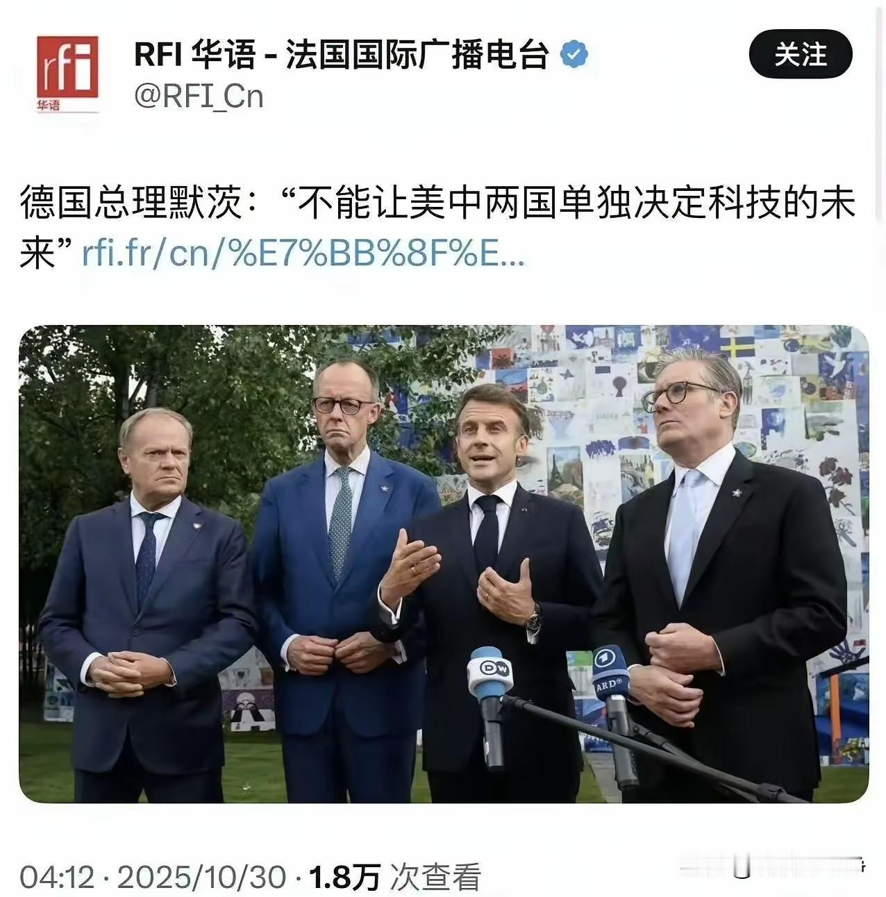 釜山会谈,最终的结果是中美之间的停战。关税大战不打了,很多制裁都放开了。 中国的稀土又向美国供应了,而美国的芯片又恢复向中国销售了。 双方又回到了之前那样的合作关系。 一下欧洲人慌了。 德国总理默茨表示,不能让中美两国单独决定科技的未来。 而其他欧洲国家也有相同的论调。 他们慌神就对了。 因为他们知道自己已经变成了一盘菜。 欧洲的地位现在非常的尴尬,他们已经彻底得罪了俄罗斯。 想恢复过去的关系,那是很难的。 这场俄乌冲突表面上看大毛和二毛打了一个千疮百孔。 但是实际上掏钱最多的还是欧罗巴这帮公子们。 现在是俄乌冲突吸他们的血。 大漂亮割他的肉。 龙爷通过正常的生意往来,不断赚他们的钱。 这种窘境让他们痛苦不堪啊。 欧公子想要翻过身来,目前看只有利用大国之间的矛盾闪转腾挪。 如果中美两国恢复如初了,贸易战不打了。 那么欧洲人连这点闪转腾挪的空间都没有。 下一步肯定是直接上餐桌。 没有人去打他们,用不着动用军事手段。 就正常的做生意,正常的外贸就能把他们刮干净。 因为时间越拖越长,中美两国的科技突破也就会越来越多。 一旦欧洲科技优势不再。 那可就是无尽的剥削呀 所以他们彻底慌神了。