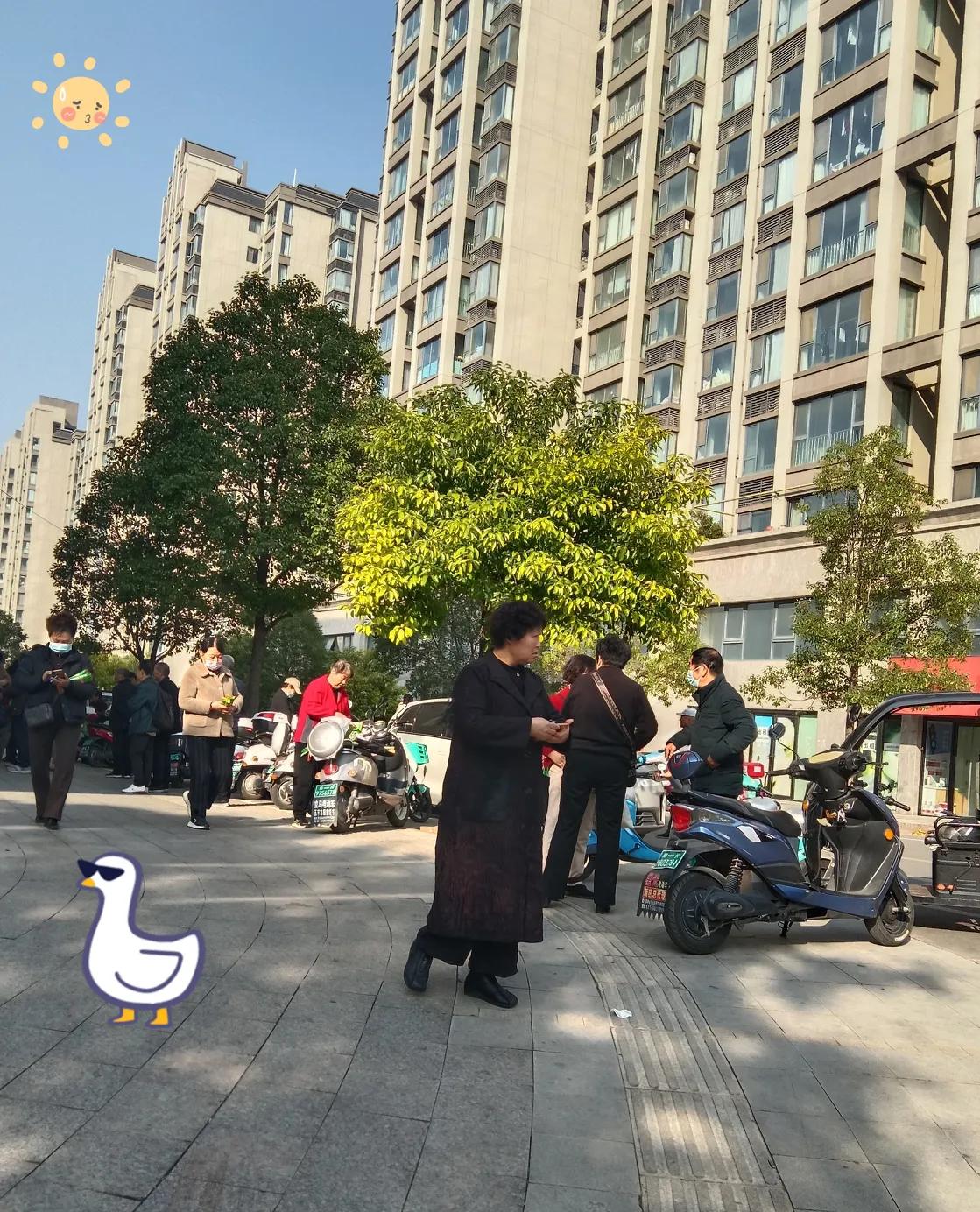 这是一个阳光明媚的小区门口,居民们三三两两聚在一起。有人在闲聊,有人低头看手机,还有人在电动车旁整理东西。 几棵绿树点缀其间,高楼在阳光下显得格外清晰。大家脸上带着轻松的表情,享受着这片刻的悠闲时光,仿佛在等待着什么,又或许只是 单纯地享受这惬意的氛围。