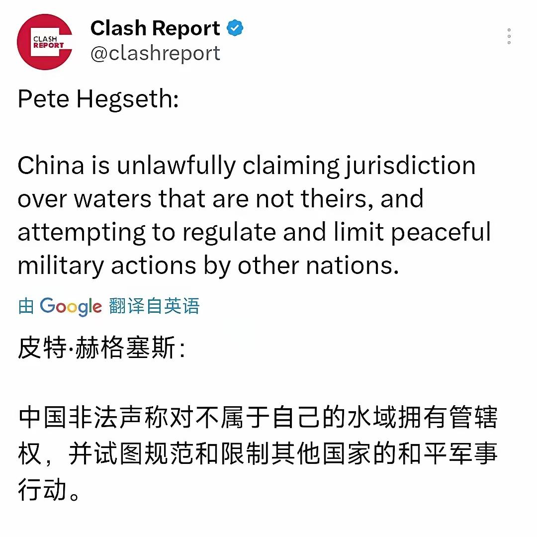 美国战争部长赫格塞思日前说:“中国非法声称对不属于自己的水域拥有管辖权,并试图规范和限制其他国家的和平军事行动。” 赫格塞思短短一句话三大错误: 一,不是管辖权:是主权。不是声称,是真实拥有的主权,并且, 二,是由美国在当年用美国军队替中国收回的。 三,主权国家对未经批准同意的在自己的水域进行非法的所谓“和平军事行动”进行规范和限制是理所当然,并且已是极大克制。 赫格塞思,如果他能认真回顾一下2016年美军与中国海军在南海对峙时首先眨眼的历史就会懂得,在中国水域接受中国的规范和限制行动是最好的选择,而不是像现在这样用错话和谎言堵满自己的嘴。