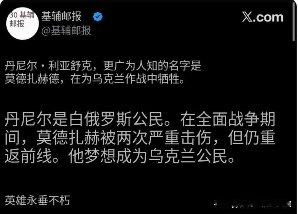 乌克兰的价值观 来自《基辅邮报》的讣告: “丹尼尔·利亚舒克,更广为人知的名字是莫德扎赫德,在为乌克兰作战中牺牲。 丹尼尔是白俄罗斯公民。在全面战争期间,莫德扎赫两次严重负伤,但(伤愈后)仍重返前线。他梦想成为乌克兰公民。 英雄永垂不朽!” 乌友们来点根蜡上柱香磕三头吧 丹尼尔·利亚舒克绰号“圣战者”,渴望成为 ISIS 恐怖组织一份子,他的绰号也由此而来。 他因在顿巴斯实施酷刑和强奸儿童遭举报后被乌克兰当局逮捕判刑,但后来由于乌克兰需要士兵,他被释放并送往前线。 当年斯捷潘·班德拉及其追随者也因犯事儿被纳粹德国判刑关进监狱,但由于战事越来越不利于德国,于是希特勒把他们放了出来对抗苏联红军。这个丹尼尔的经历跟他的前辈还颇为相似。 #俄罗斯新核潜艇出坞##俄乌冲突#