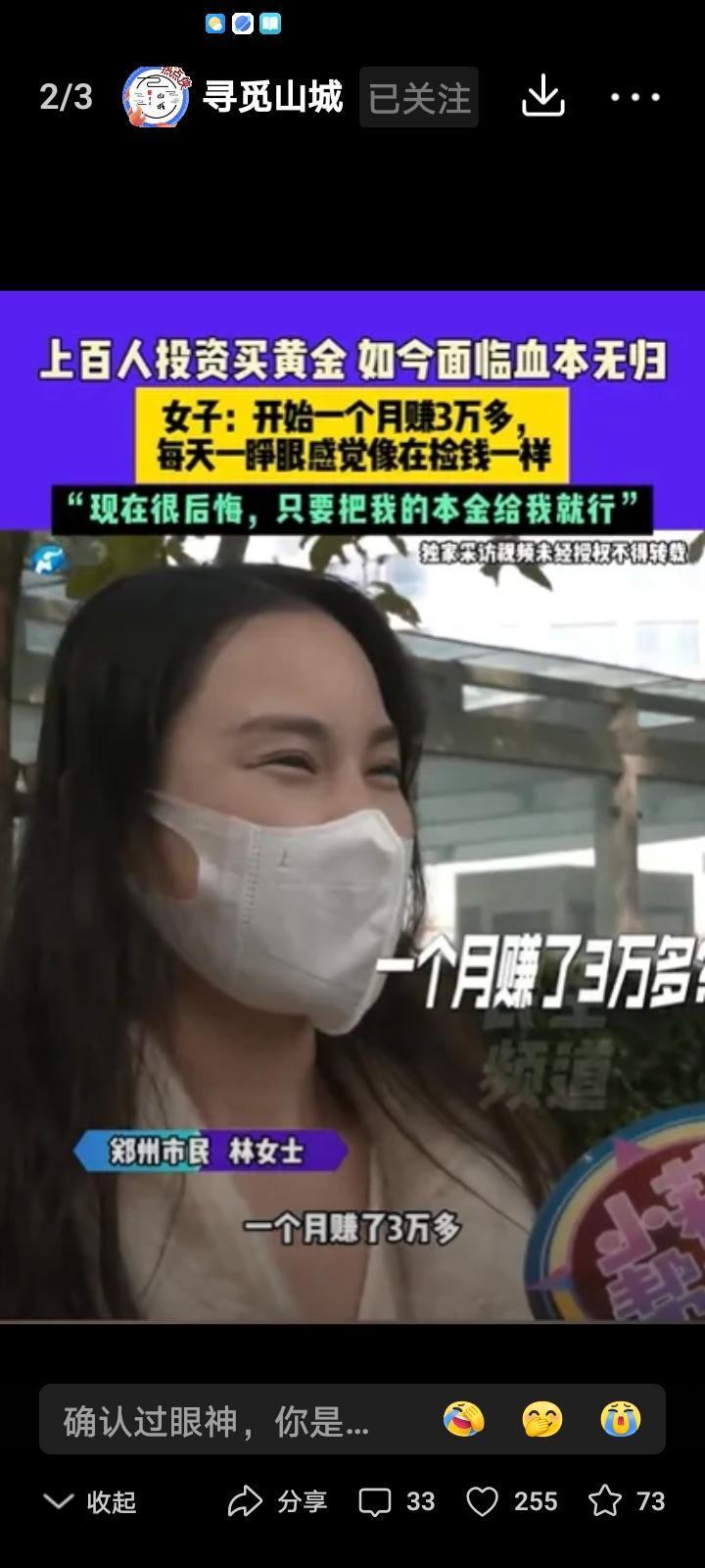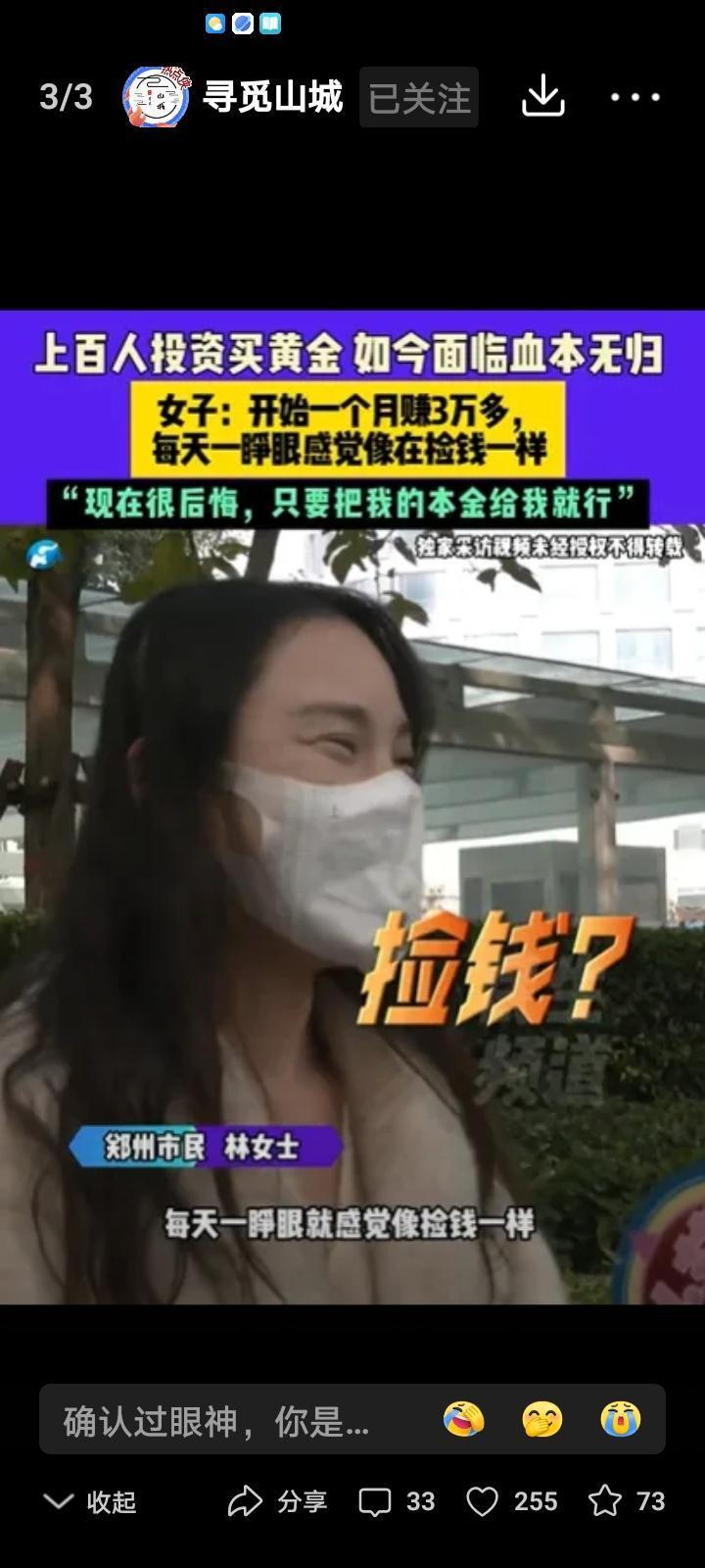 贪心不足蛇吞象!河南一女子为了赚大钱,投资6万买黄金,开始1个月赚3万多,每天都在涨,一睁眼感觉像在捡钱一样,连班都不想上了,可仅仅1个月后,群里发消息说,公司亏损,会在3天内结清,但从此了无音讯!如今面临血本无归,女子很后悔:现在利润不利润都无所谓了,只要把我的本金给我就行! 女子刷短视频时,看到有一个卖黄金和回收黄金的人,大盘价加两块钱的,她觉得很划算,他们还做了一个小程序,并且他有好多万的粉丝,在上海有实体店! 所以女子就比较信任他们,她凑够6万全投了进去。接下来一个月,收益跟坐火箭似的涨,不到30天就赚了3万。女子走路都飘了,上班都不想上了,每天一睁眼就敢像捡钱一样,跟同事炫耀“现在躺家里都比上班挣得多”,跟老公说“以后不用再省吃俭用了”。 提现7000,立马就到账了,就对他更加信任了,可没想到一个月之后,群里发了一张公告,公告内容就是说公司出现了经营不善,三天内给大家结清。女子连夜去的上海,发现已经有很多人在那儿问他要款,有一个大姐在地上跪,磕头,跪着求着他,抱着他的腿,还扇自己的耳光。 公司老板就一句话说我没钱,我赔了。女子表示:现在是利润不利润都无所谓了,只要把我的本金给我就行。有网友表示,别扯认知,就是贪蒙了眼--真有天天涨的好事,主播早自己闷声发大财了,还会带你? 这事儿一出来,评论区直接炸了锅。有人说这女的太傻,明眼人都能看出来,哪有黄金天天涨还不带停的?大盘价都是跟着市场波动的,加两块钱买还能赚这么多,本身就透着古怪。还有人说那个上海实体店就是个幌子,粉丝多也能花钱刷,这些表面功夫最容易骗到想走捷径的人。 老话说天上不会掉馅饼,这话真没说错。普通人过日子,哪有只赚不赔的买卖?你想着人家的高利息,人家盯着的是你的本金。就像之前小区里张阿姨,听人说投资玉石能翻倍,把养老钱都投进去,最后连人影都找不到了。 说到底,还是贪心害了人。要是这女的当初见好就收,或者一开始就不相信这种离谱的收益,也不会落到血本无归的地步。不贪意外之财,守住自己的本金,才是咱们普通人该有的理财经。各位读者你们怎么看?欢迎在评论区讨论。