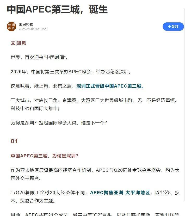 中国APEC第三城,举办地花落深圳。这意味着,继上海、北京之后,深圳正式晋级中国APEC第三城。从过往APEC峰会举办地来看,要么是首都,要么是经济中心或科技中心,要么是知名国际旅游城市,后者普遍都位于沿海地区。彼时,广州、深圳、杭州、厦门、青岛、天津、成都、西安等地呼声最高,最终深圳脱颖而出。从国际峰会来看,杭州之于G20,厦门之于金砖峰会,西安之于中亚峰会,青岛、天津之于上合峰会,不一而足。从大型赛事来看,亚运之于广州、杭州,大运会之于深圳、成都,都展现出城市的综合竞争力。