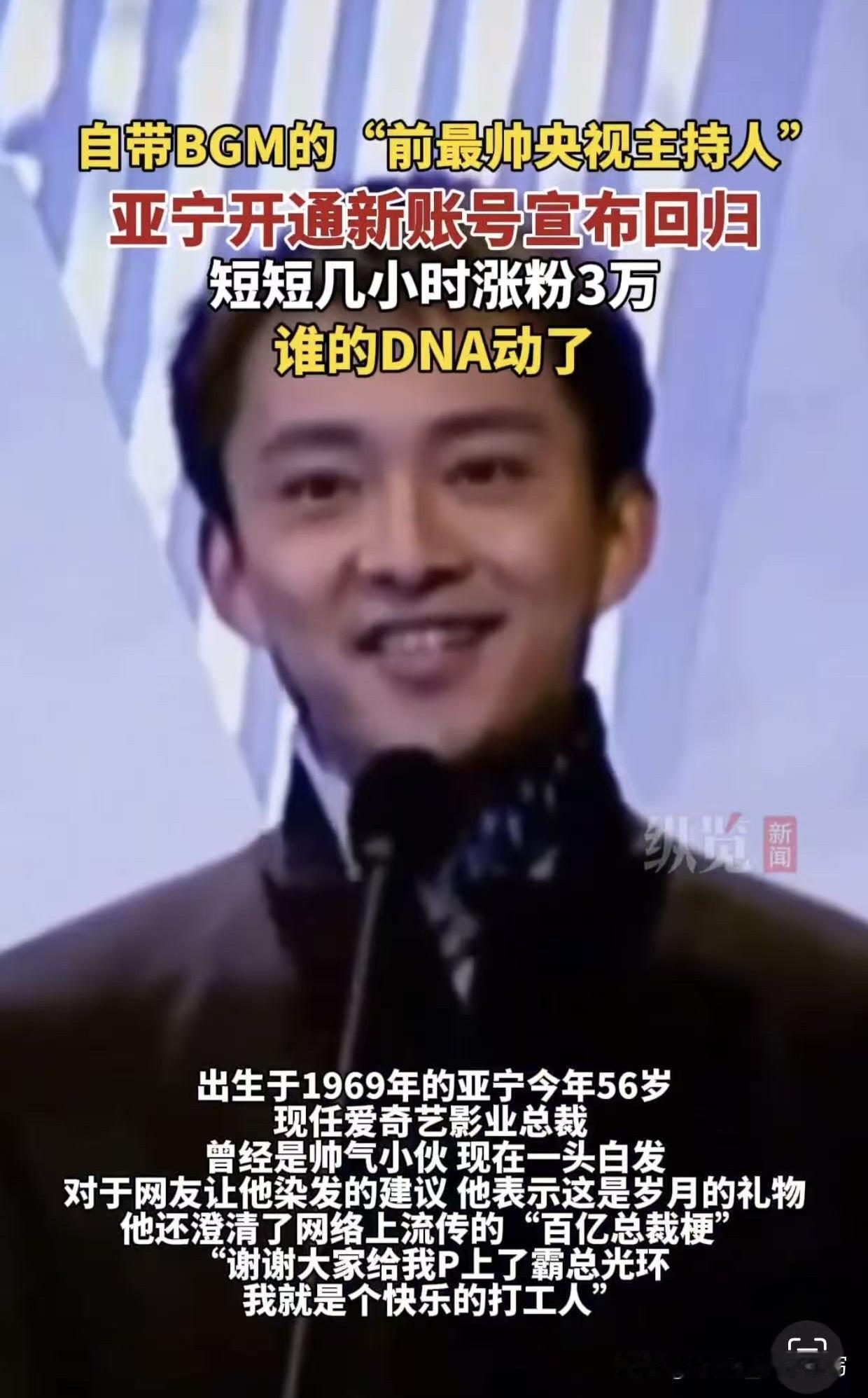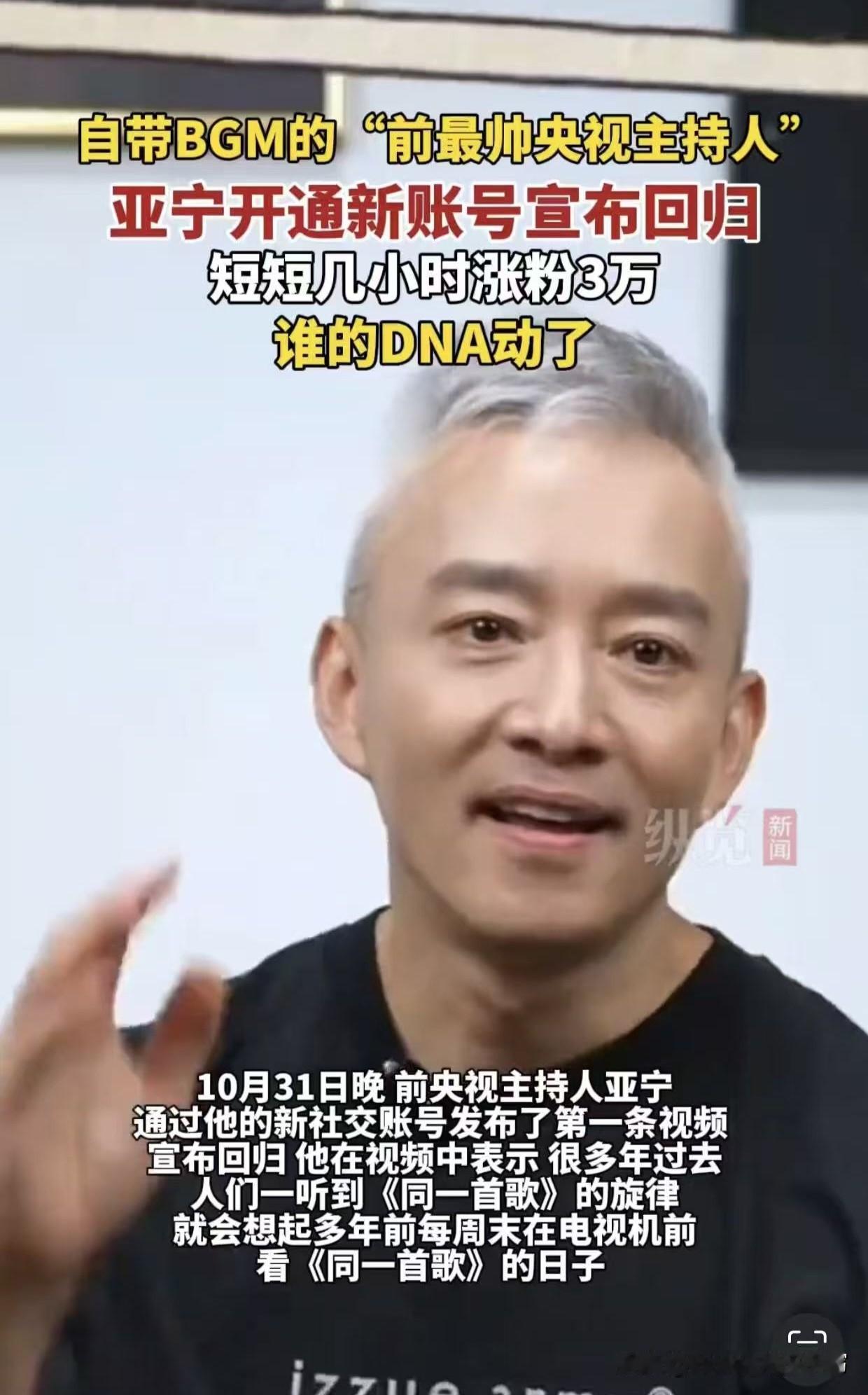56岁亚宁一头白发回归,全网泪目了! 那个《同一首歌》的帅气主持,如今发如雪,却依旧温润如玉。 他笑说:“头发是叛逆了点,但我挺喜欢。” 一句话,把多少人的青春拽了回来? 曾几何时,全家围坐等他报幕, 那句“欢迎收看《同一首歌》”是多少人心底的温暖记忆。 如今他现身澄清:“百亿总裁”是玩笑,我就是个快乐打工人。 没有架子,只有真诚,岁月染白了他的发,却没带走他的光, 对此你怎么看?