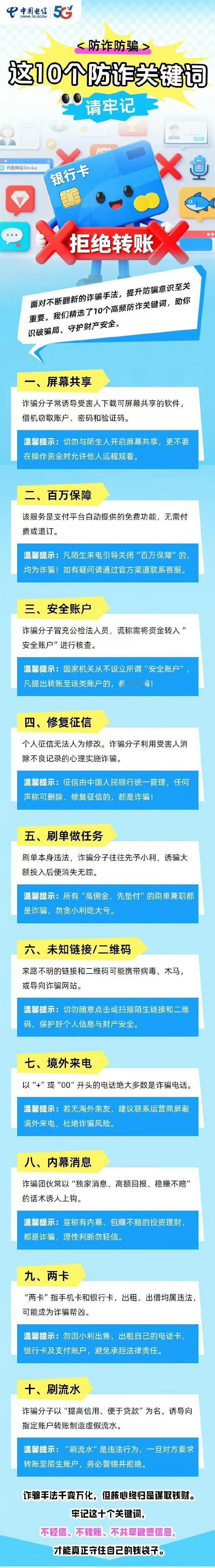【这10个防诈关键词,请牢记!】面对不断翻新的诈骗手法,增强防骗意识至关重要。精选10个高频防诈关键词,助你识破骗局,守护财产安全。via:中国电信 法姐讲法