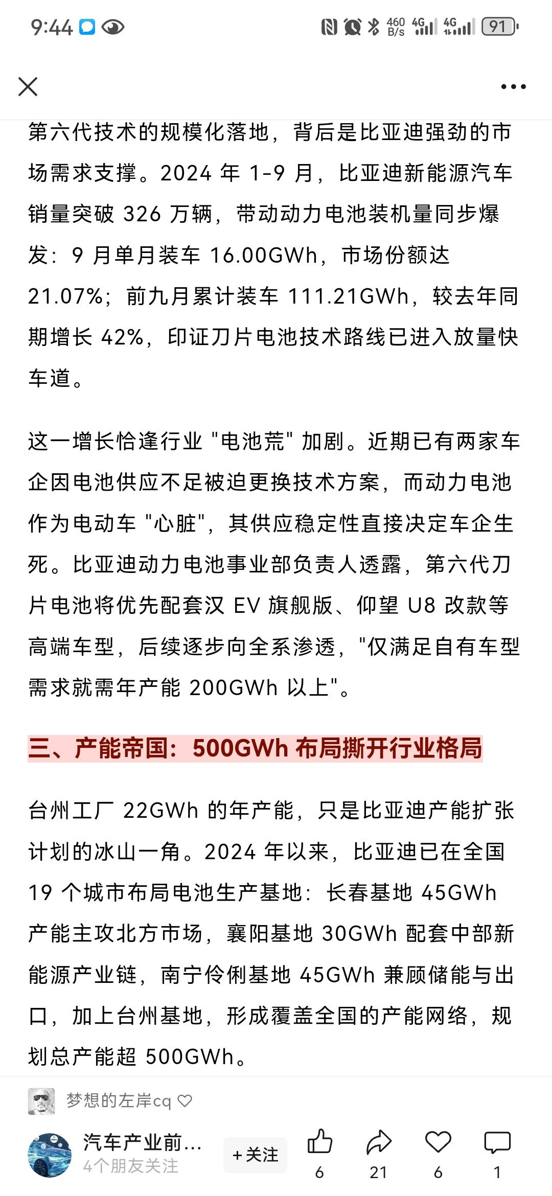 当大家还在讨论比亚迪的第二代刀片电池何时普及的时候,想不到第六代都已经投产了!我只能说迪子真的是深藏不露啊,这个坐落在浙江台州的新一代生产线,不仅仅把能量密度提升了15%,成本还降低了10%,据说还能把纯电续航提升到1000公里,当然,这就要看明年比亚迪会不会推出这么强悍的纯电新车型了。众所周知,比亚迪有捞不完的技术鱼池,但是毕竟每条鱼从捞出来到发布到新车上,都是需要至少两三年的磨合测试时间的,毕竟谁也不能把新车主当小白鼠不是。