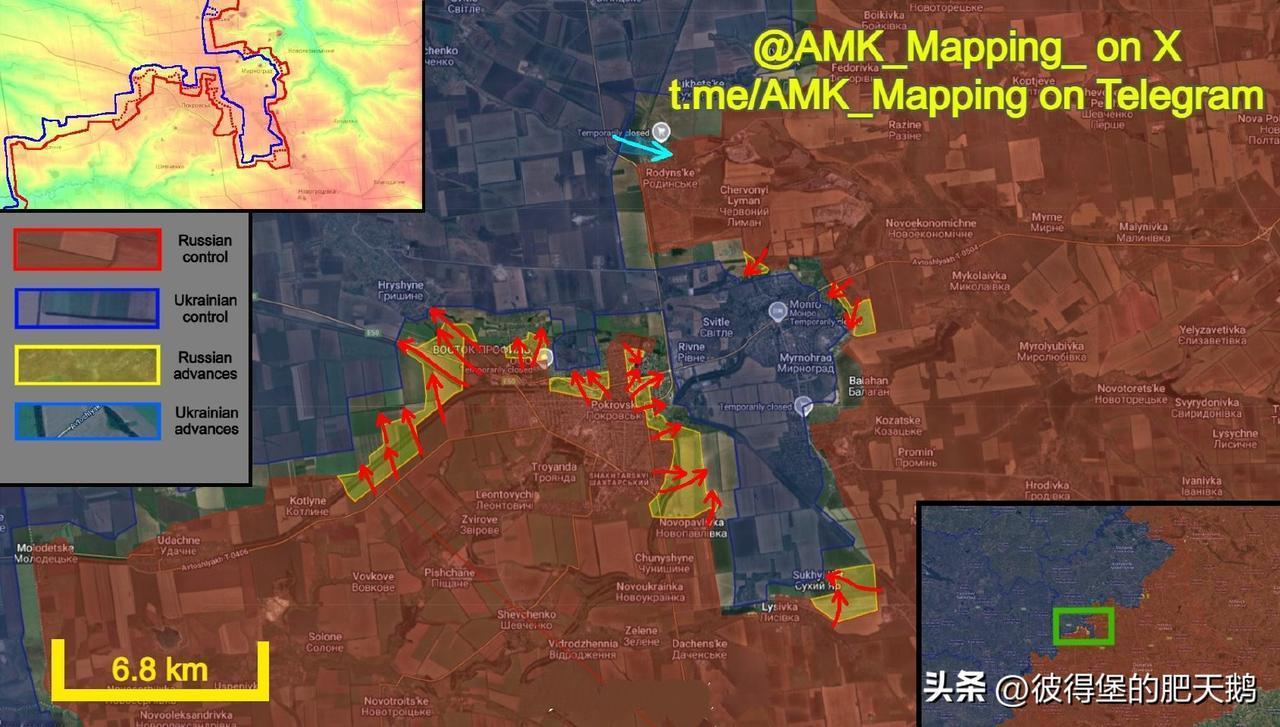 AMK公布波克罗夫斯克(红军城)方向最新战况: 俄军持续取得重大进展,因此波克罗夫斯克的大部分地区目前已处于俄军控制之下。 在波克罗夫斯克以西,俄军完全控制了从乌达奇涅延伸出的铁路线,并开始向更北的树林地带推进。此外,俄军开始沿铁路线向巴甫洛格勒推进,攻占了其中2.2公里长的路段,并抵达了小型简易机场。他们还进入了赫里什涅的郊区,开始争夺那里的乡间别墅区。 在波克罗夫斯克北部,俄军推进至最北端的居民区并在那里巩固了阵地。他们还从市中心的一个新地点越过铁路线,控制了其余的设防工业区和地下掩体系统,随后向剩余的居民区推进。 在波克罗夫斯克东北部,俄军进入高层住宅区,并控制了其余的低层住宅街道。他们还攻占了工业区的大部分剩余区域,突破至城市东缘的工厂,同时其他部队夺取了更多的居民区。 在波克罗夫斯克以东,俄军完成了对赫纳蒂夫卡和 Rih 村以及附近铁路线的占领,随后推进并攻占了更东边的树林地带。他们还夺取了新帕夫利夫卡的最后一部分区域。 在米尔诺格勒以南,俄军从新霍罗迪夫卡市向苏霍伊亚尔推进,攻占了该村的东部地区以及南部的树林地带。 在米尔诺格勒北部,俄军在低层居民区取得了进一步进展,朝着市中心方向推进,并攻占了更多的高层建筑。他们还夺取了米尔诺格勒北部工业建筑内的更多区域。 与此同时,在波克罗夫斯克以北,过去五天里,乌军渗透到罗金西克北部,控制了俄军在当地学校内外的一些防御薄弱的阵地。该地区的战斗仍在持续,但乌军的入侵区域有限,俄军仍控制着该市的大部分阵地。 11月1日 + 俄军净推进约18.14平方公里。 + 乌军净推进约0.73平方公里。 #俄称在红军城围困乌军# #俄方回应委内瑞拉求援# #俄乌冲突#