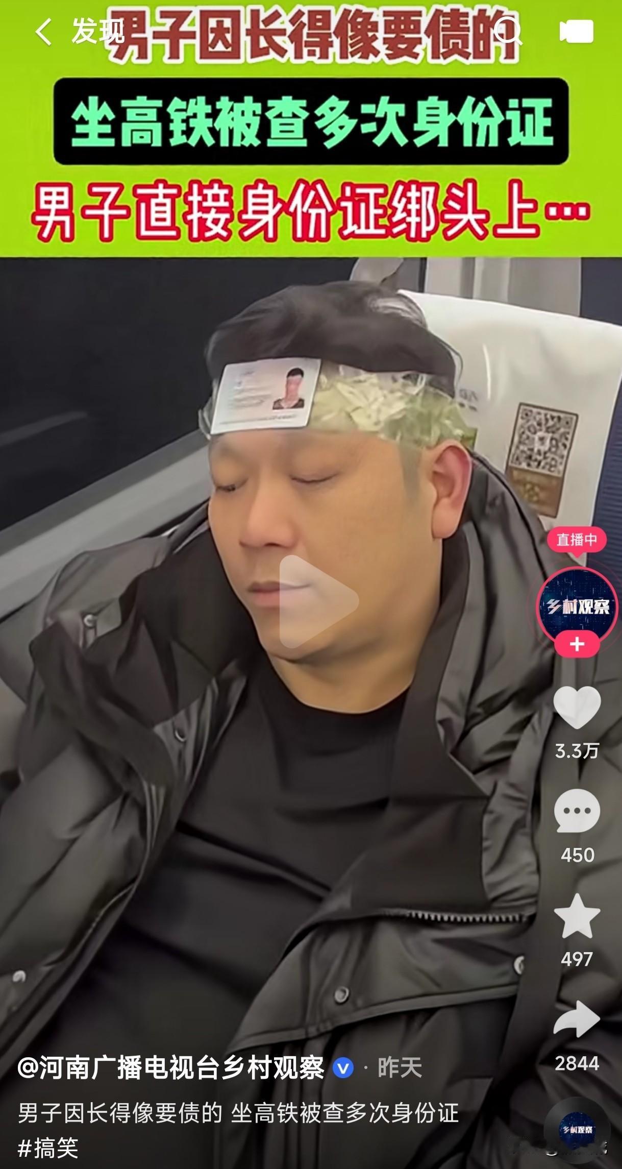 男子因长的像要债的 坐高铁被查多次身份证 最后无奈直接把身份证绑头上 这是长的不像好人查身份证的次数也就多了吗 话说身体发肤受之父母 这基因的遗传能怪自己吗 这长相的基因是父母给的 天生就这样谁都改变不了 这从相貌上就能看出好坏吗 这多次查身份证的操作实在让人无语 但偏偏不查别人就查自己 这搁谁心里不是也憋屈吗 索性把身份证绑在头上好了 不管谁来查当场就能看到 省的自己反复往出拿了 这样不是方便多了吗