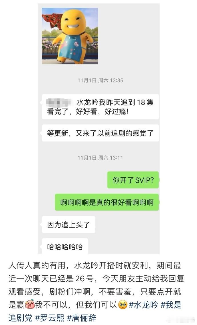 水龙吟剧粉开始人传人现象了水龙吟最近《水龙吟》的剧粉们真是越来越疯狂了。大家不仅在朋友圈热烈推荐,还组织了“人传人计划”,口口相传地安利这部剧。每个人都充满热情地推销这部剧,确保每个人都能看到它的魅力。