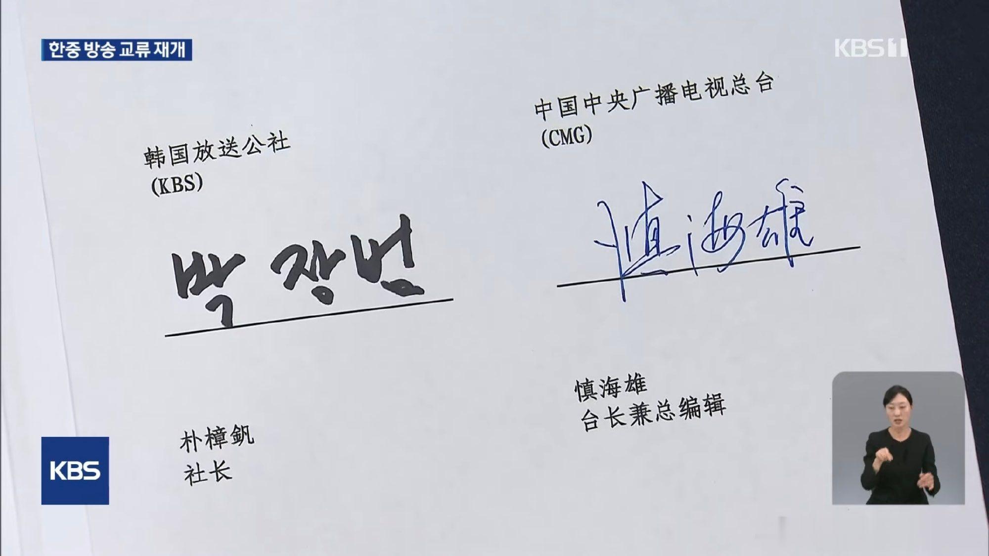 韩国放送公社(KBS)与中国中央广播电视总台(CMG)在APEC期间签署了加强媒体交流的合作协议: