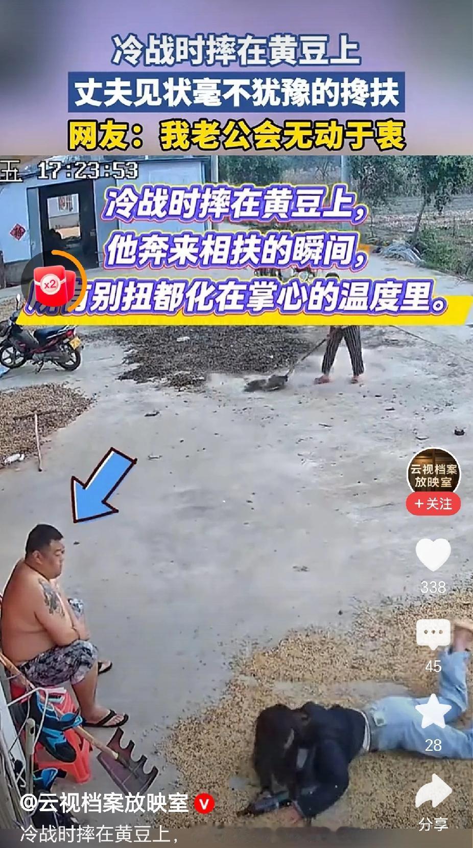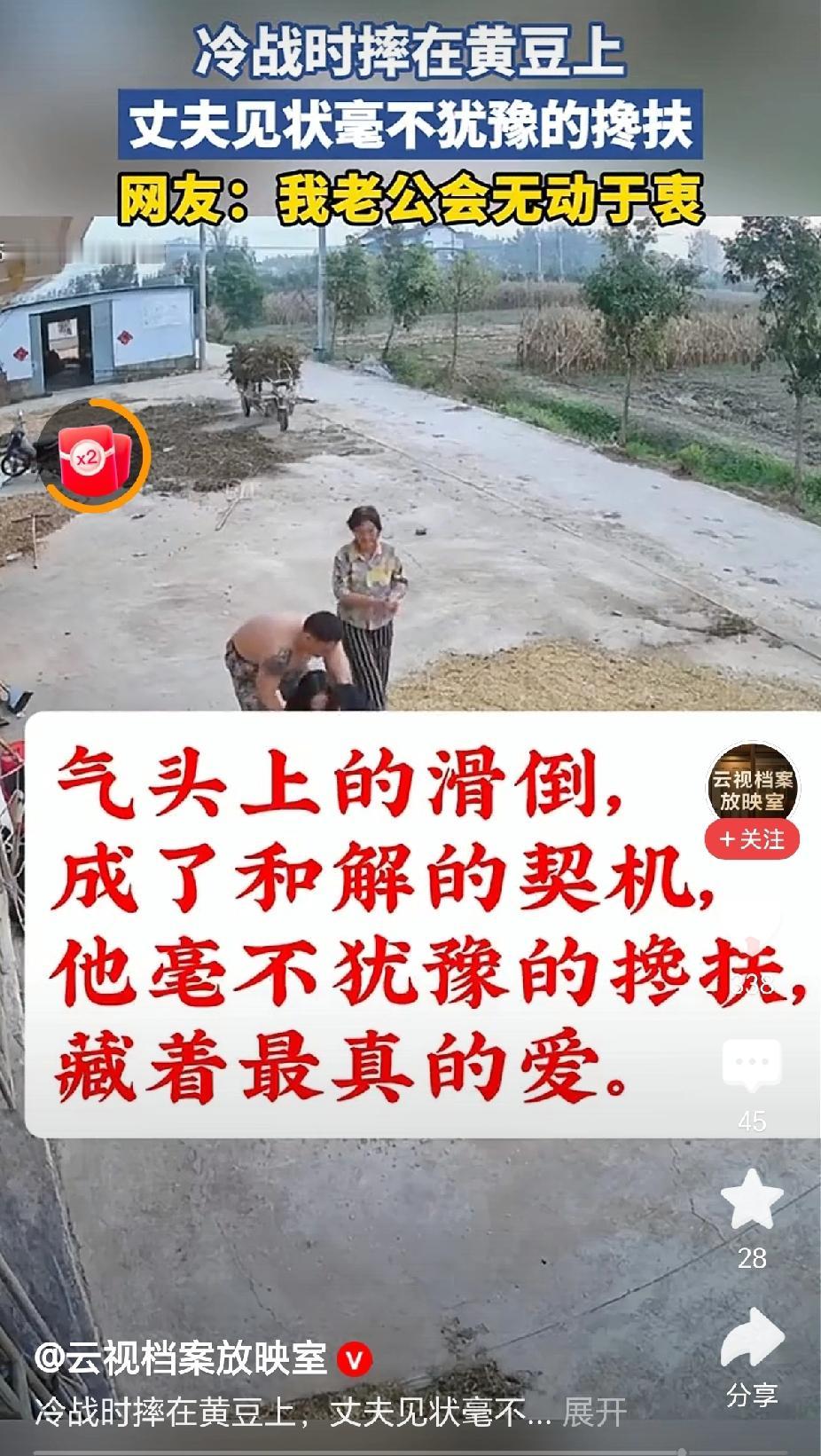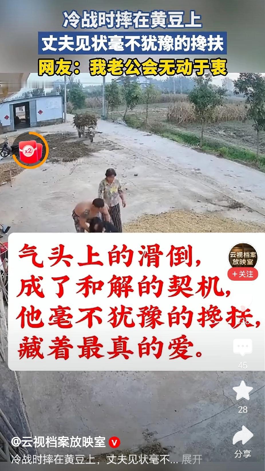“和解了,女子和丈夫冷战时不小心在黄豆上摔倒,丈夫立马上前搀扶!”一女子和丈夫因为家庭琐事拌嘴了,正在气头上的妻子,却不小心摔倒在黄豆上,丈夫毫不犹豫的上前将妻子扶起来!(来源:@云视档案放映室v) 据视频报道,一家人正在秋收秋晒的时候,正在气头上的妻子从晾晒的黄豆上走过,不小心一下就滑倒了。 坐在旁边的丈夫看见妻子摔倒,不管正在生闷气,赶紧跑过去一把将老婆扶了起来。“摔疼了没有?”丈夫暖心的问道。 “没事没事!”妻子也及时的回话。气头上的滑倒成了和解的契机,他毫不犹豫的搀扶藏着最真的爱! “冷战时摔在黄豆上,他奔来相扶的瞬间,所有的别扭都化在掌心里的温度里!”妻子在家中的监控视频里说到。 “我老公会无动于衷!”有网友说道,这没有真正的生气,要是我老公在气头上,他动也不会动,才不会过来扶呢! “夫妻之间哪有那么多的气呀!”有网友评论说,有一个契机就和解了,这都是生活中的一些小事情。 是呀,人生两个人陪伴最久的就是夫妻了,生活中的磕磕绊绊是难免的,但有一个契机,有一个机会,就能够让吵架的两个人和好如初。 婚姻也就像是流淌的河流,虽然会碰到石头,但终归会向前奔流而去。夫妻就像两朵相互的浪花,朝着前方的目标一起向前! 对此,你的看法是怎样的呢? @秋实99 关注人生冷暖,拥抱幸福生活!冷战时摔在黄豆上,老公及时上前搀扶