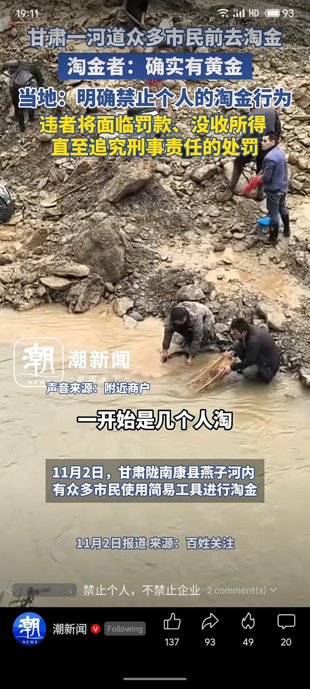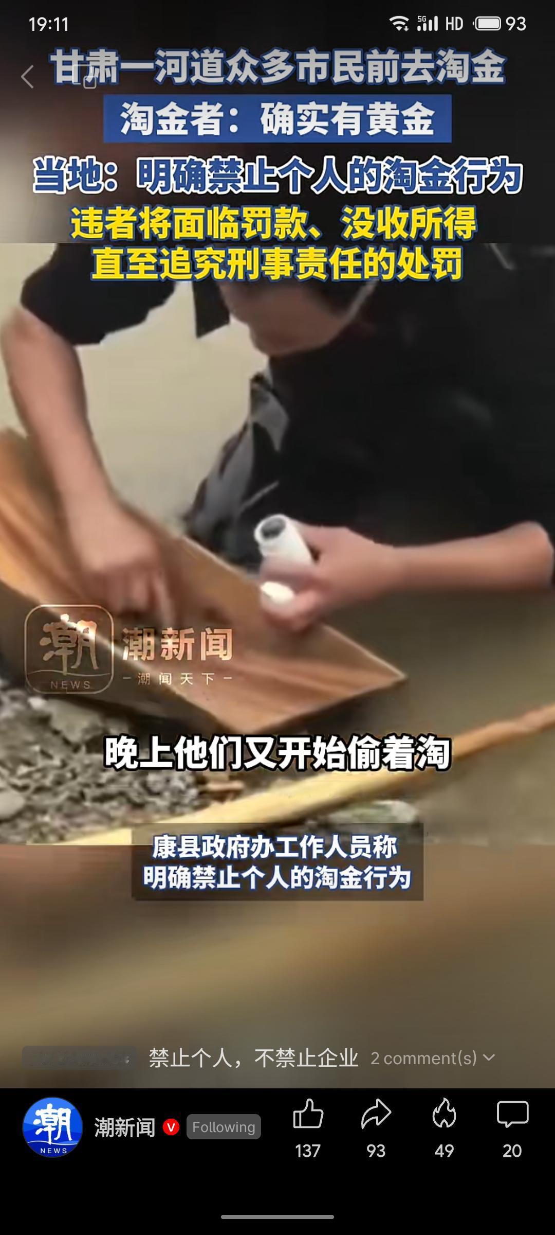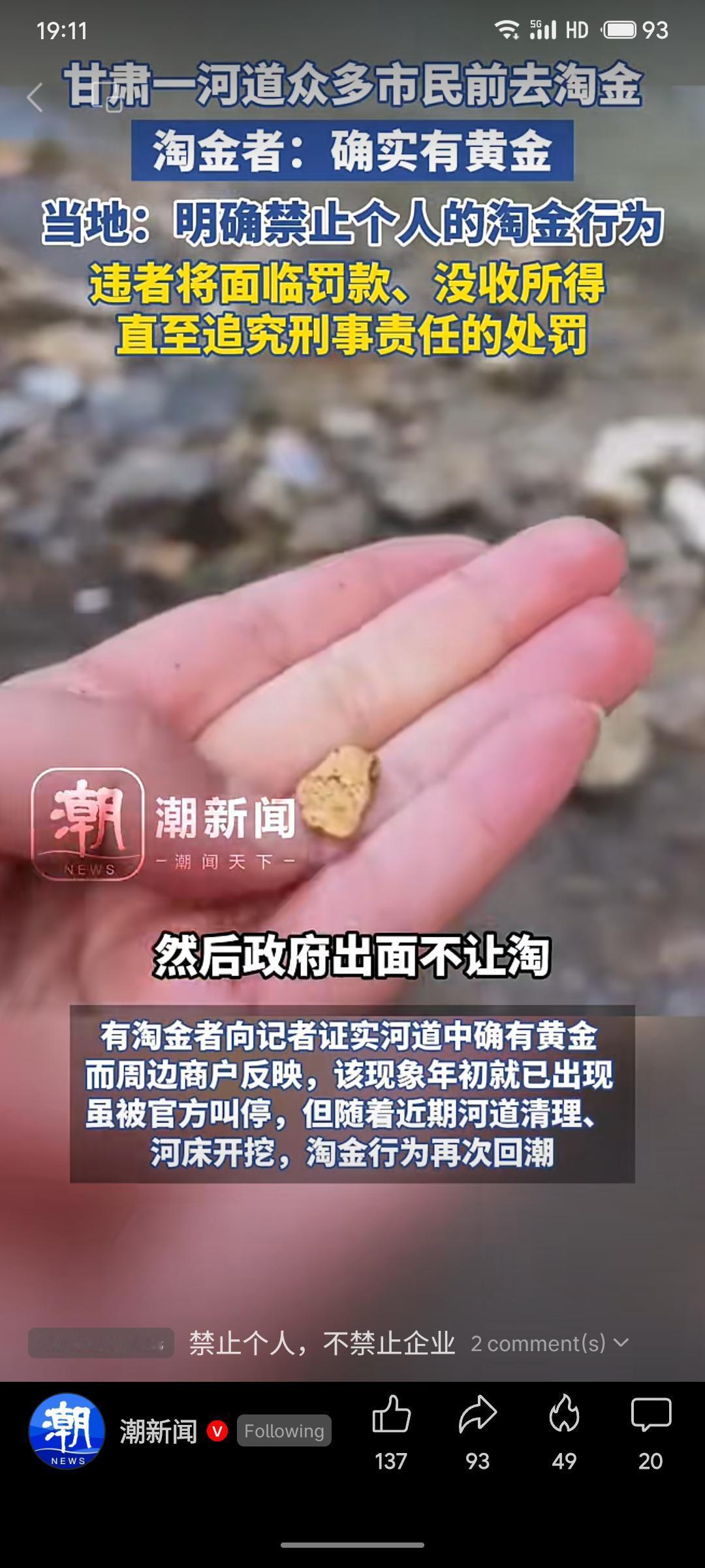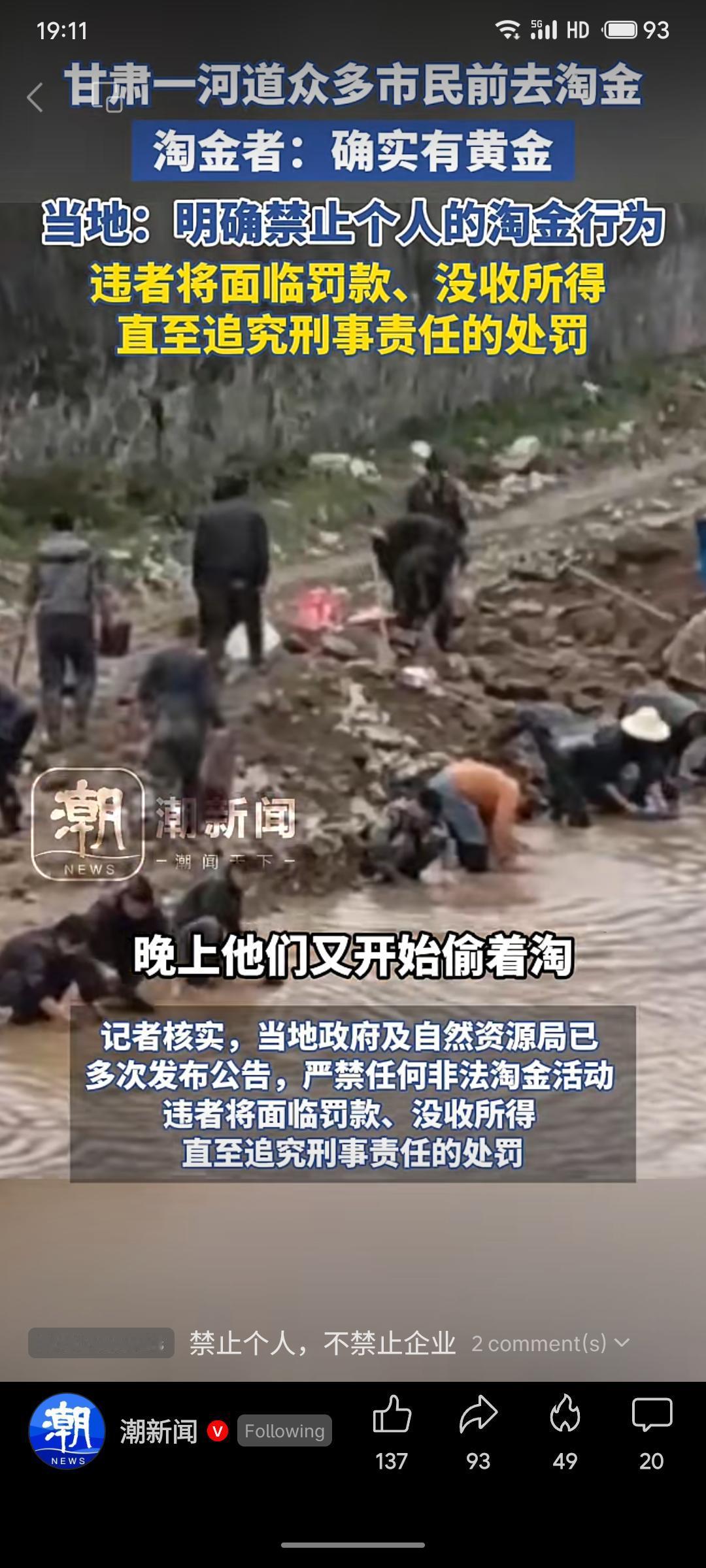 甘肃一河道现市民淘金热,淘金者证实河内确有黄金。尽管当地政府明令禁止个人淘金行为,违者将面临罚款、没收所得甚至刑事责任,但仍有民众利用晚间偷着淘,屡禁不止。热门评论质疑“只禁个人,不禁企业”的规定。