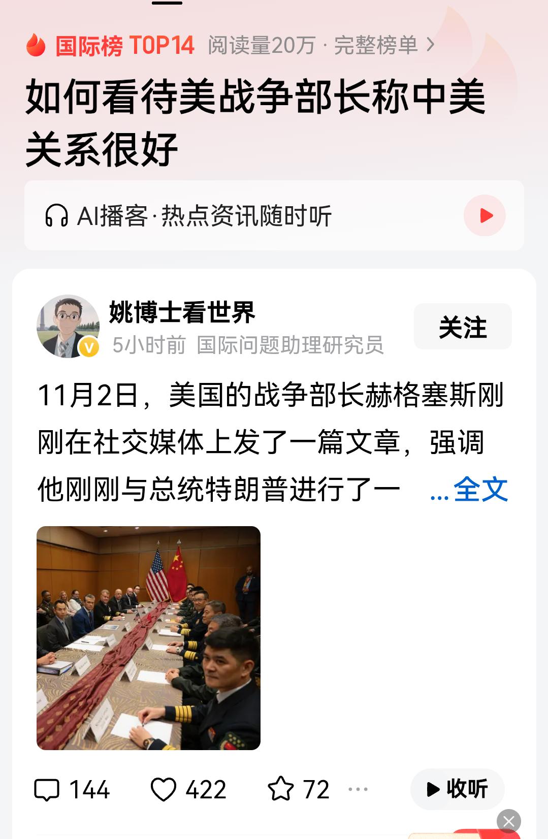 美国战争部长声称,中美关系从未如此之好。这并非敷衍的话,而是真实的。因为从中美交往的历史上来看,现在是中国实力最接近美国的时候。实力越相当,中美关系就会越稳固,战争就会越远离。美国认识清晰而准确。