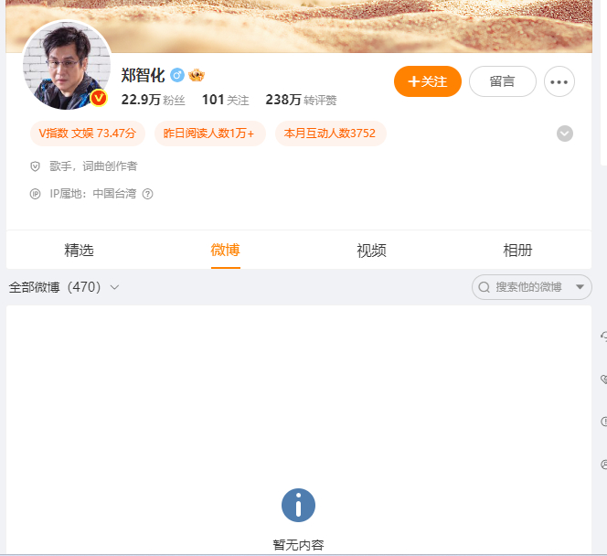 【】#郑智化道歉贴已无#​​​据页面显示,郑智化微博已清空。​​​​此前,郑