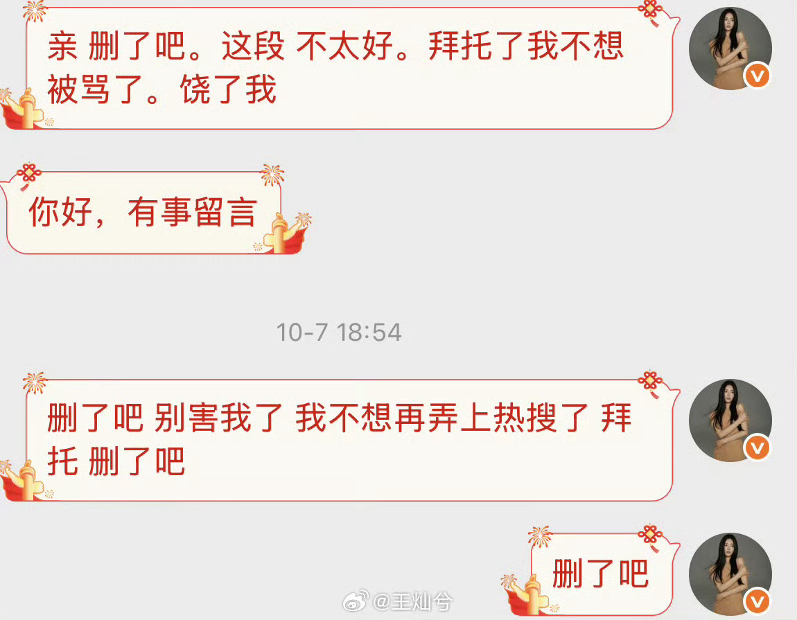 王灿发文说没买热搜更没有包年,并晒出了发私信删帖的截图。王灿说没买热搜更没有包年