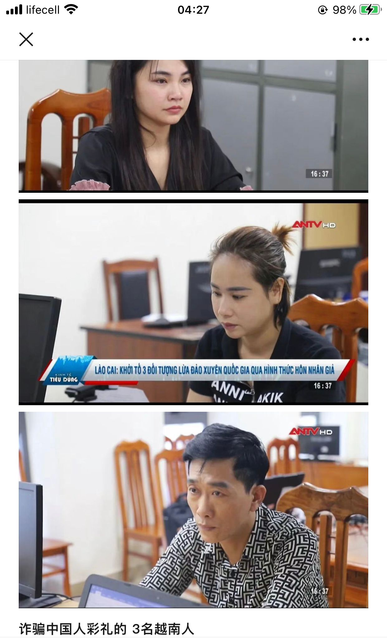越南方面称:3名嫌疑人合谋策划剧本,让李氏梅香出境至中国,假意与一名中国男子结婚。主要目的是骗取该男子支付的4亿越南盾(近11万人民币)“彩礼钱”。