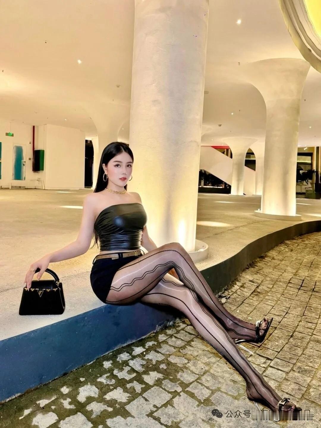 夜晚的街头,时尚女郎坐在木椅上,散发着迷人的魅力。