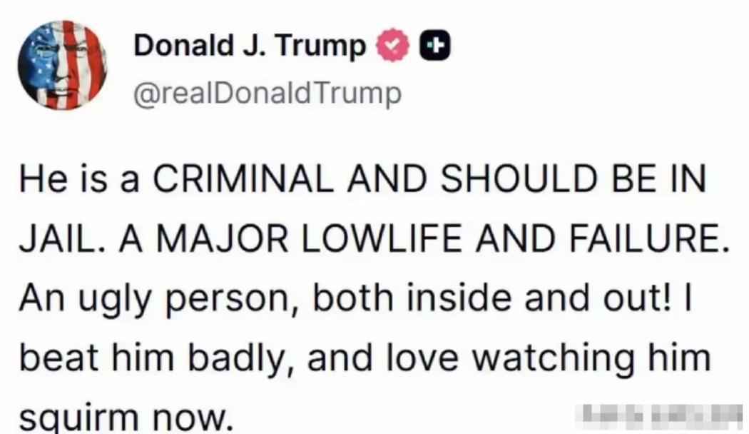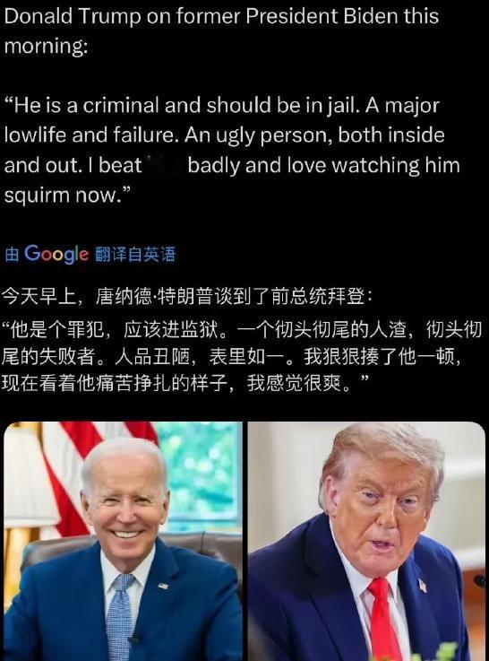 懂王又在个人平台上,各种揶揄拜振华,想不到美国今天的总统会这样,面对上一届美国总统是毫不客气,甚至幸灾乐祸。毕竟大家也知道,拜振华刚刚确诊癌症,从手术中恢复过来,结果懂王说了这些话。简直普通人都难以出口,博主也不去说懂王骂了些什么话语,大家可以看图片里面的翻译,就知道懂王有多么愤怒了。 毕竟拜振华是懂王内心里,挥之不去的梦魇。大家也知道,在2020年的选举当中,拜振华击败懂王,当选美国总统之后,懂王在拜振华的四年时间里,受到了很多不公正待遇,但懂王是都挺了过来,重新击败哈里斯,又当上了美国总统。 如果是这样的话,所以懂王对拜振华的怨念很深,单纯就是政见不合,以及各种不满意,但是以前美国总统和前任总统关系,怎么也能说得过去? 现在看来,懂王和拜振华关系是没法弥补了,互相指责,那是真的无所不有其极。当然了具体里面有多少恩恩怨怨,我们只是知道九牛一毛,里边肯定还有更多的内幕和竞争,这是不能对外公布而已。 民主党和共和党的党争,已经是势同水火,后续还会带来什么样的结果,博主暂时不清楚。