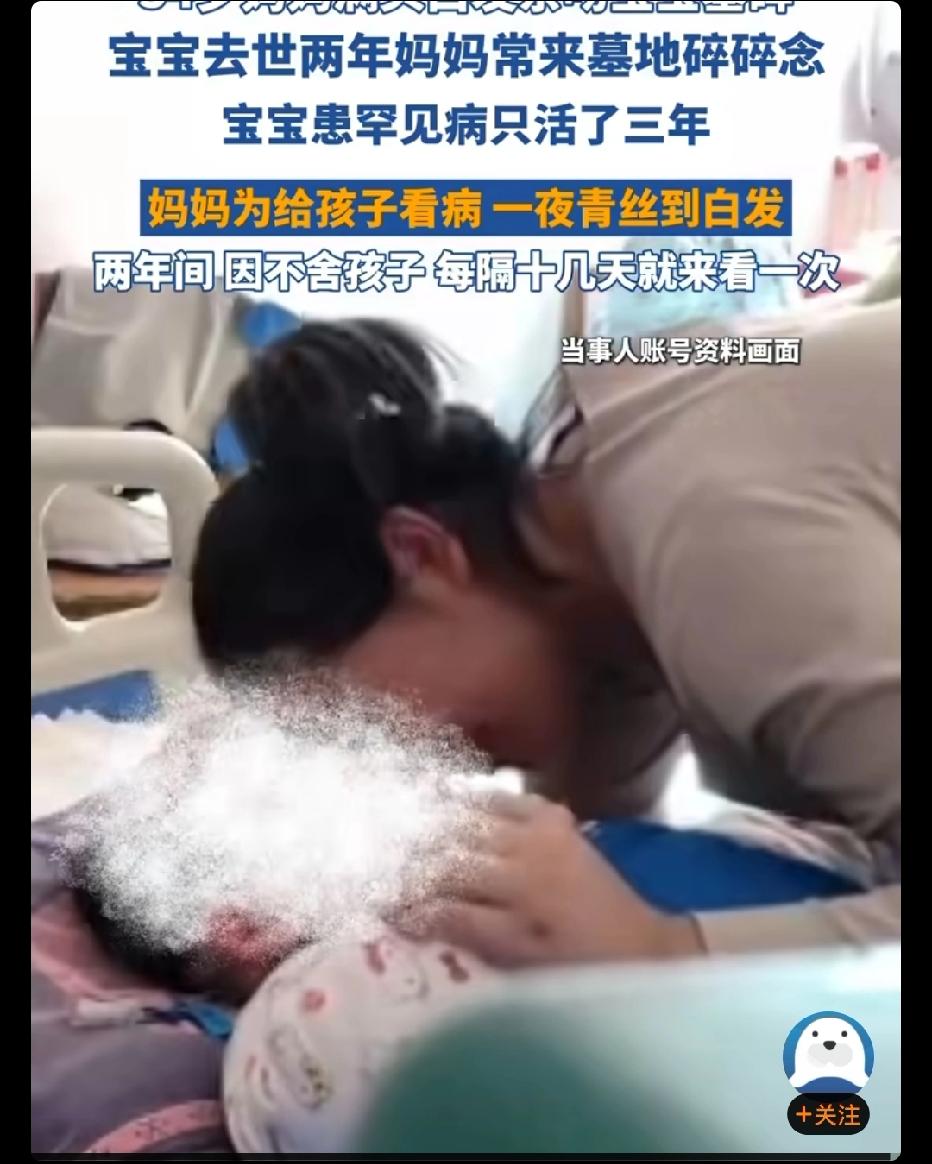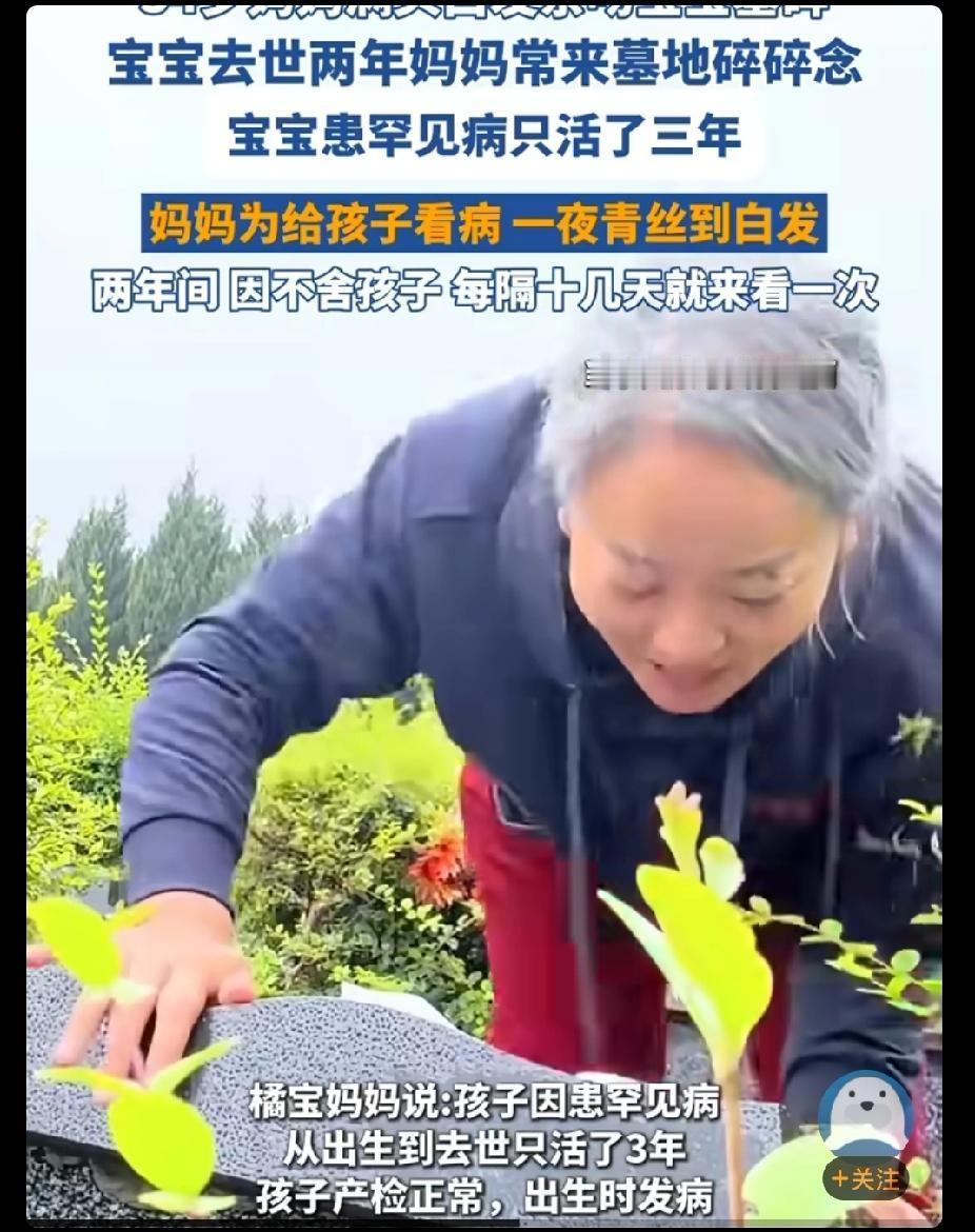 白发母亲轻吻墓碑:妈妈在呢,只是换种方式爱你 河南南阳,有一位年仅34岁的母亲,一头白发格外扎眼。每一根银丝,都藏着一段痛彻心扉的过往。 两年前,她3岁的宝贝,因一场罕见疾病,永远阖上了双眼。孩子的离去,如同一把利刃,瞬间抽走了她世界里的所有色彩,也把无尽的悲痛,凝结成了她早生的白发。 两年来,无论风雨,每隔十几天,她都会来到孩子的墓前。墓园格外安静,唯有风吹树叶的沙沙声。她缓缓俯下身,就像孩子还在襁褓中时一样,温柔而深情地亲吻着冰冷的墓碑。 那一刻,时间仿佛凝固。在亲吻中,她倾诉着无尽的思念:“妈妈在呢。” 这句简单的话语,跨越了生与死的界限,是她对孩子永恒不变的承诺。 这个深情的吻,落在石碑上,却刺痛了所有人的心。它让我们看到,母爱如此强大,强大到足以抗衡时间与死亡。她用自己的方式告诉孩子:你从未被遗忘,爱,也从未消逝。 墓地里的妈妈