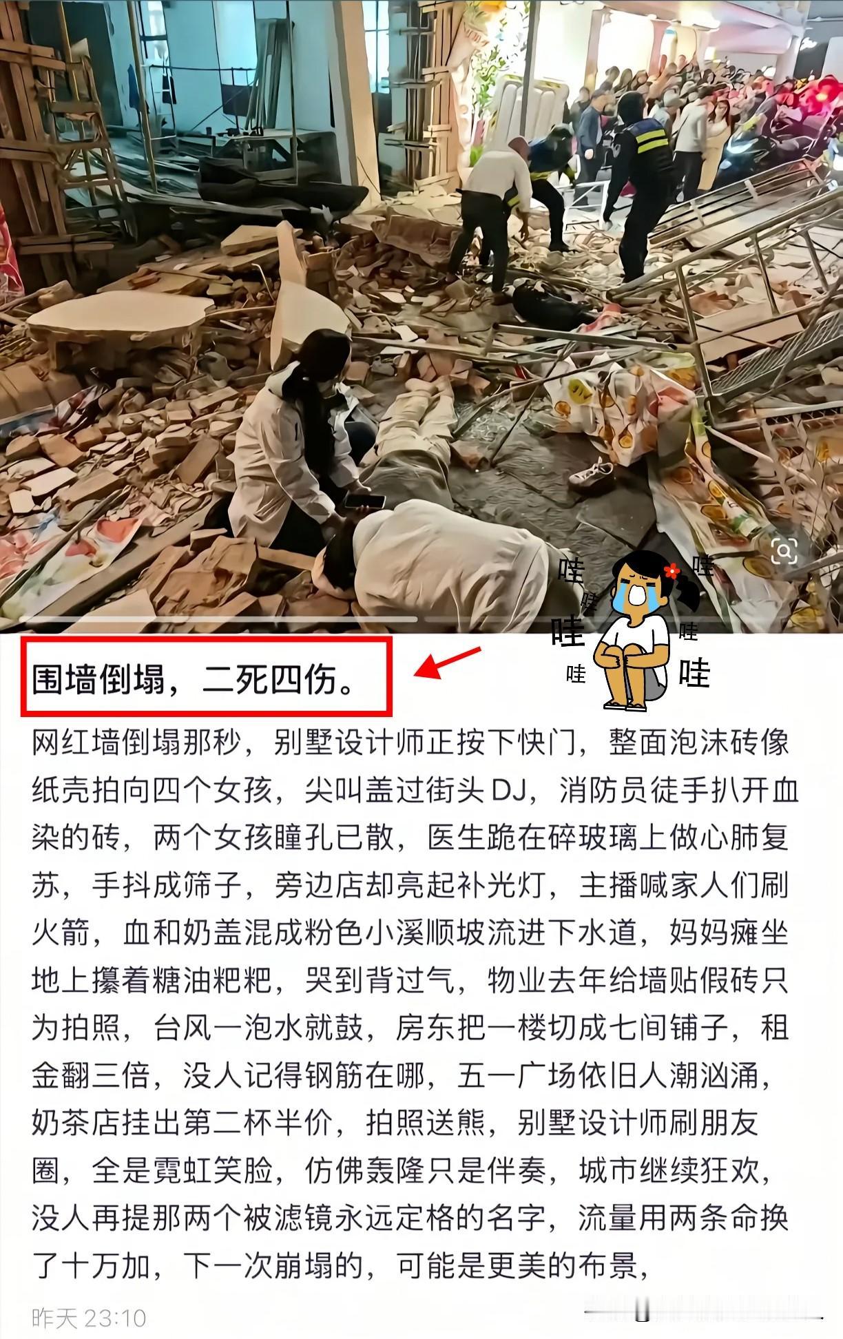 长沙这一次坍塌事件,遇难的这个女生,真的不敢想象会给这个男生造成多大的阴影,估计一辈子都走不出来了。 长沙潮宗街的一声巨响,让一个普通的瞬间变成了永恒的噩梦。一面墙体突然倒塌,当场砸倒了一名女生,而她的男朋友就在身边,却只能发出撕心裂肺的哭喊,什么也做不了。 原视频里的哭声,不是简单的悲伤,而是那种眼睁睁看着最爱的人从眼前消失、自己却无能为力的绝望。这种画面,光是隔着屏幕听着都让人心脏揪紧。 我们常说“明天和意外不知道哪个先来”,但只有当意外真的发生在身边时,才能体会到这句话的残酷。对于这个男生来说,这可能不是几天、几个月就能走出来的坎,而是要用一辈子去消化的创伤。 分手的痛苦尚且需要很久才能平复,更何况是亲眼目睹挚爱之人的离去?女孩的表姐说,他们是从小一起长大的,早已是彼此生命里不可分割的一部分。这种“半个家人”的感情,在悲剧发生的瞬间,被彻底碾碎。 这件事也让曾仕强老师的一句话再次被提起:“不要经常去人多的地方,容易发生事故。”这听起来像是一句朴素的提醒,但在悲剧面前,却显得无比沉重。它不是要我们因噎废食,而是提醒我们,在享受城市繁华的同时,必须时刻警惕潜在的风险。 但比“不去人多的地方”更重要的,是城市本身的安全保障。一面墙为什么会突然倒塌?是年久失修,还是维护不当?这些问题的答案,才是对逝者最好的告慰,也是对生者最基本的交代。 意外无法完全避免,但很多“意外”其实可以通过更完善的安全检查、更及时的维护来预防。希望这次的悲剧,能推动相关部门对城市里的老旧建筑、公共设施进行一次彻底的排查,让这样的“眼睁睁看着”的悲剧,不再重演。 如果你想了解如何在日常生活中更好地保护自己和家人,我可以为你整理一份城市生活安全自查清单,帮你规避一些常见的安全隐患。需要吗?建筑倒塌 长沙危楼事件