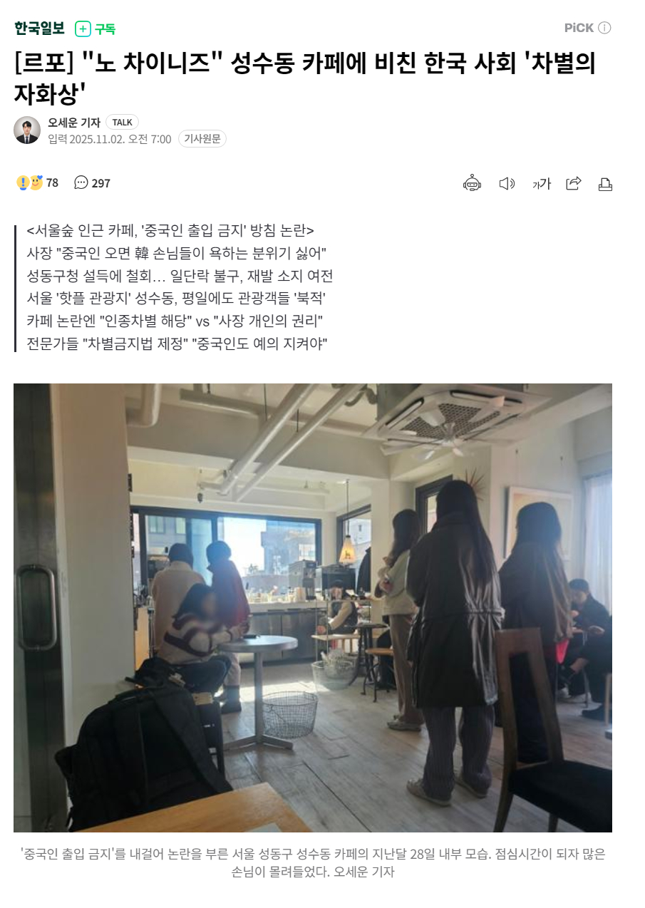 但同时,他也坦言,一般来说,中国客人确实"制造麻烦的行为"较多。"中国客人会把垃圾都扔在咖啡馆里。还有,他们过度大声交谈,甚至会突然闯进制作饮品的我的空间里进行拍摄。"虽然其中相当一部分是作为咖啡馆店主的他应该承担的问题,但他解释说,为了那些对此感到不便的多数韩国客人,也不得不采取"禁止中国人入内"的措施。