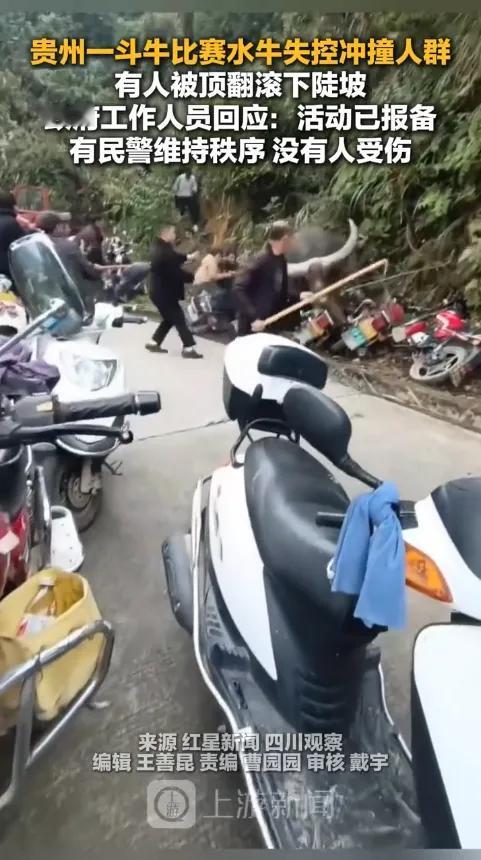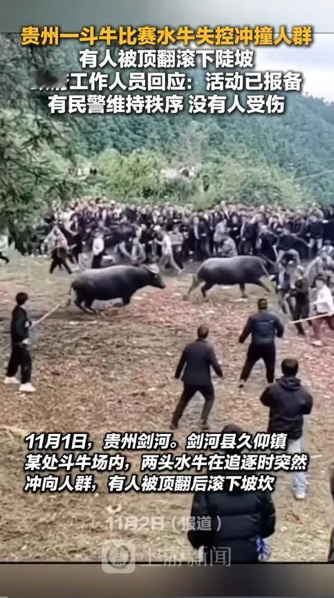 “不幸中的万幸!”11月1日,贵州剑河,斗牛场外尚未开场,牛主人手滑脱绳,两头水牛并肩冲向观众,躲避间数名村民翻滚下松软陡坡,全员无伤,网友:真·用生命看热闹! 当日传统斗牛节预热,牛主人牵“牛王”热身,木棍脱手,缰绳坠地,为首水牛瞬间受惊,撒蹄直奔土坡上的观众,另一头紧随其后,尘土飞扬。 人群炸锅,后撤通道仅一条窄田埂,前排观众脚下一滑,接连翻滚下三米陡坡,众人惊呼,却见他们陷进松土,拍拍身子自行爬起,无一人见血。 牛只狂奔不足百米,就被十余名壮汉用彩旗和绳索合围,重新套回场地;主办方当即宣布暂停比赛,检查围栏,并增派专人把守入口,防止二次惊牛。 现场视频热传后,评论区齐呼“命大”,也有人质疑:百万身价的“牛王”竟无双重牵引,观众区与跑道仅隔一道土坎,若牛角扫到人脸,后果不堪设想。 对于这件事情,大家有什么看法?