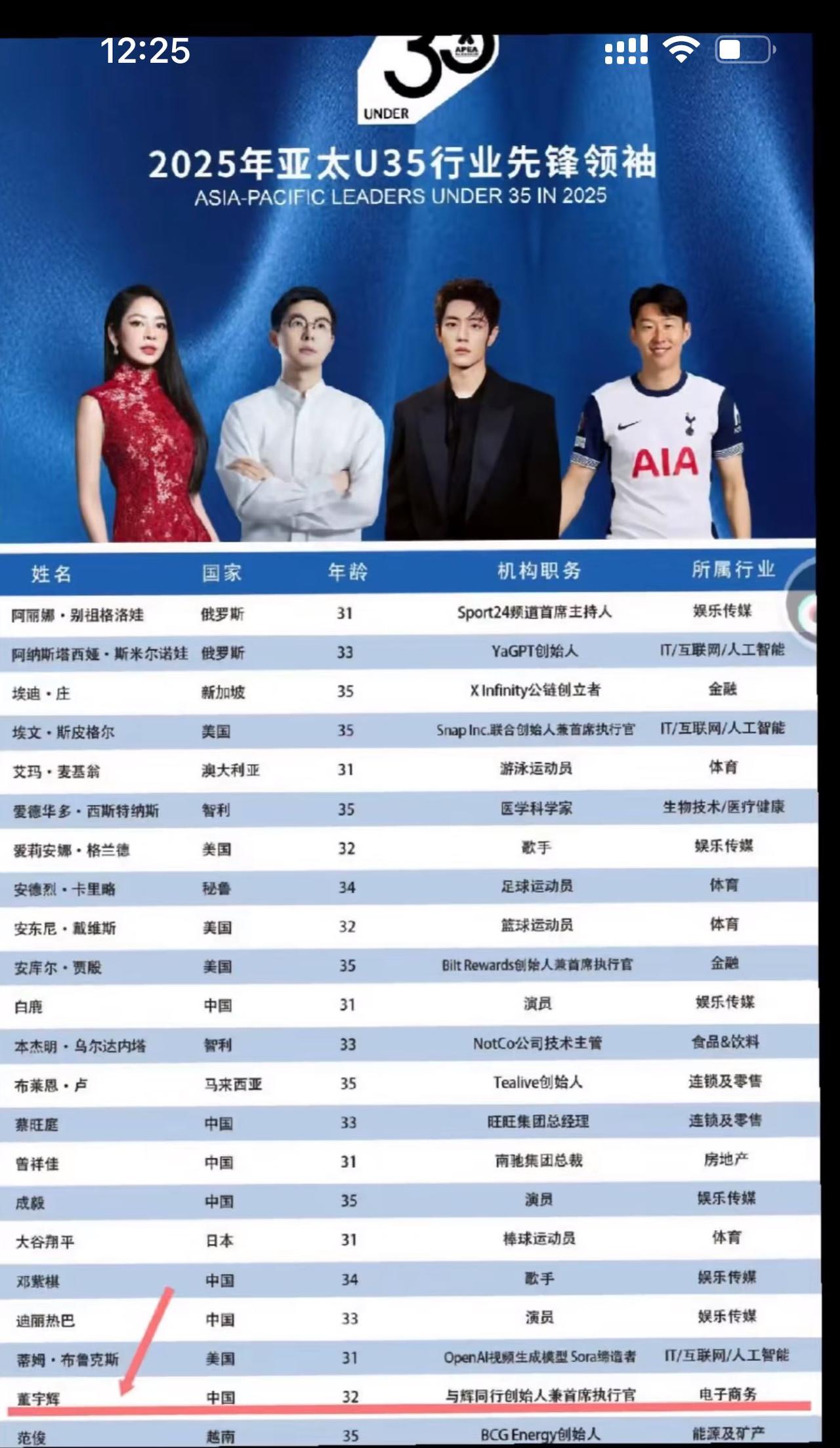 恭喜贺喜, 董宇辉入选亚太U35行业先锋领袖榜单了, 并且官方对他的身份认定是与