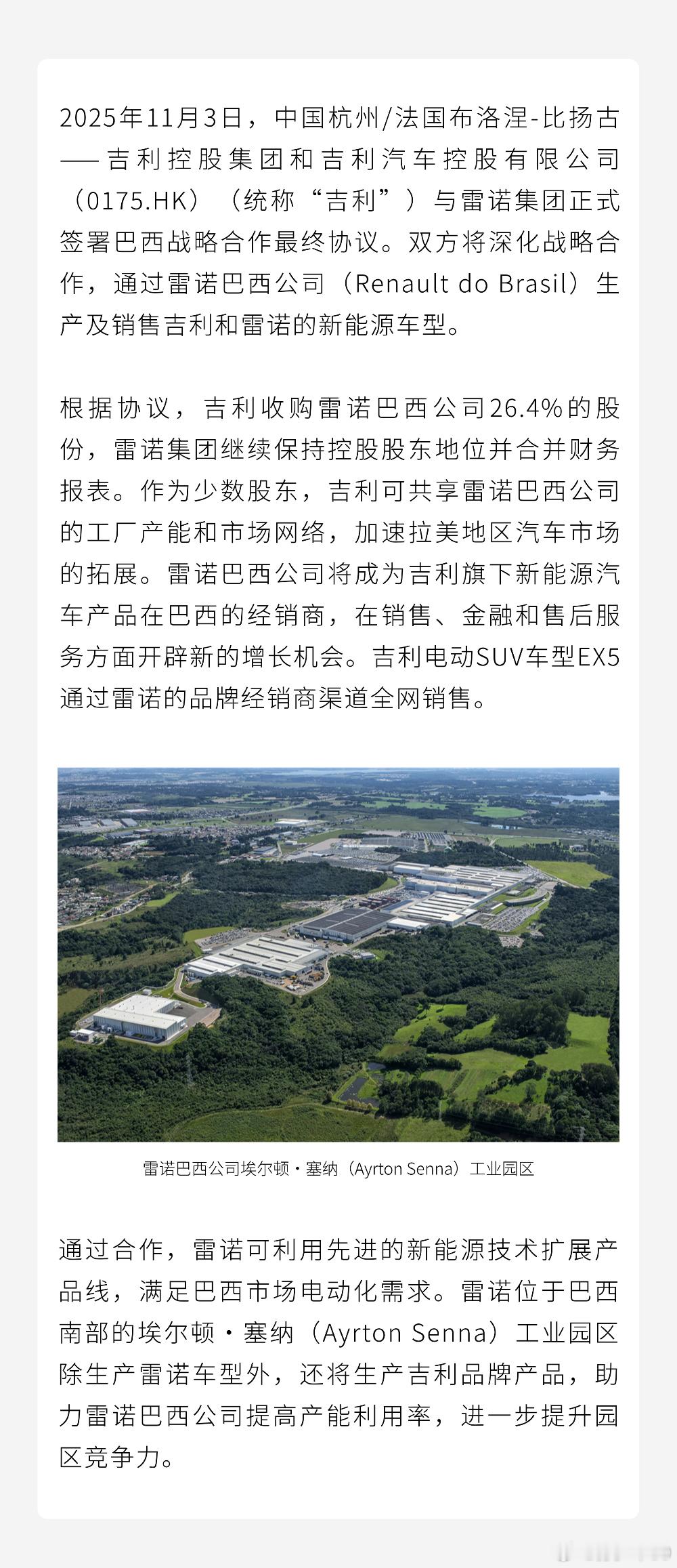 吉利与雷诺集团签署巴西战略合作协议,通过雷诺巴西公司生产及销售吉利和雷诺的新能源车型。