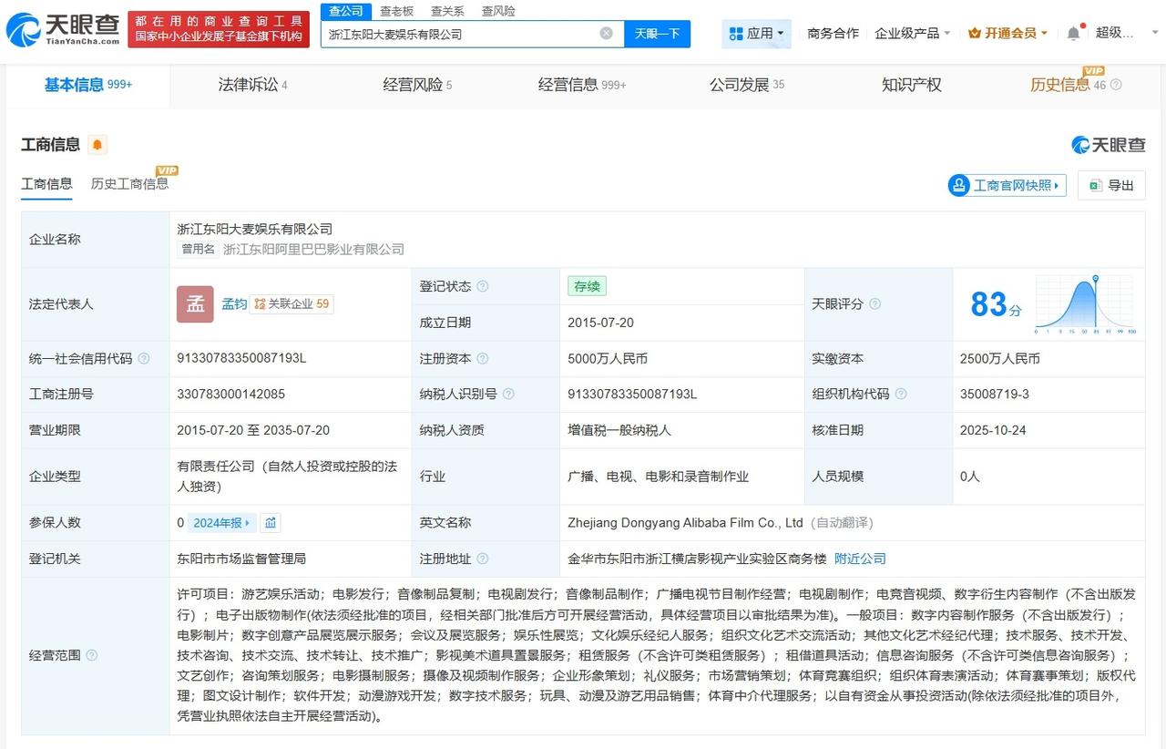 东阳阿里影业公司更名为大麦娱乐 天眼查App显示,近日,浙江东阳阿里巴巴影业有限公司发生工商变更,企业名称变更为浙江东阳大麦娱乐有限公司,同时经营范围及部分高管也发生变更。 该公司成立于2015年7月,法定代表人为孟钧,注册资本5000万人民币,经营范围包括游艺娱乐活动、电影发行、音像制品复制、电视剧发行等,由北京大麦淘娱乐有限公司全资持股。 天眼查信息: