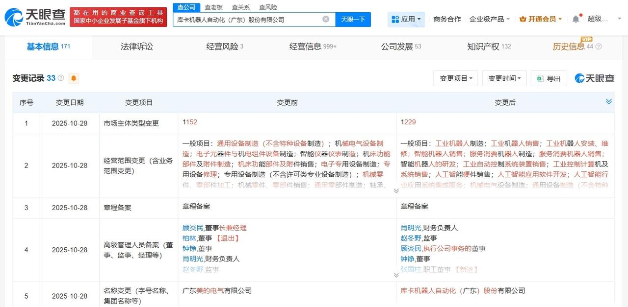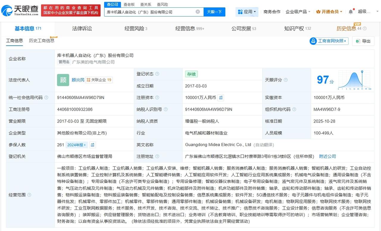 广东美的电气更名库卡机器人自动化公司 天眼查App显示,近日,广东美的电气有限公司发生工商变更,企业名称变更为库卡机器人自动化(广东)股份有限公司,同时经营范围及部分高管发生变更。 该公司成立于2017年3月,法定代表人为顾炎民,注册资本约10亿人民币,由美的集团股份有限公司全资持股。 天眼查信息:
