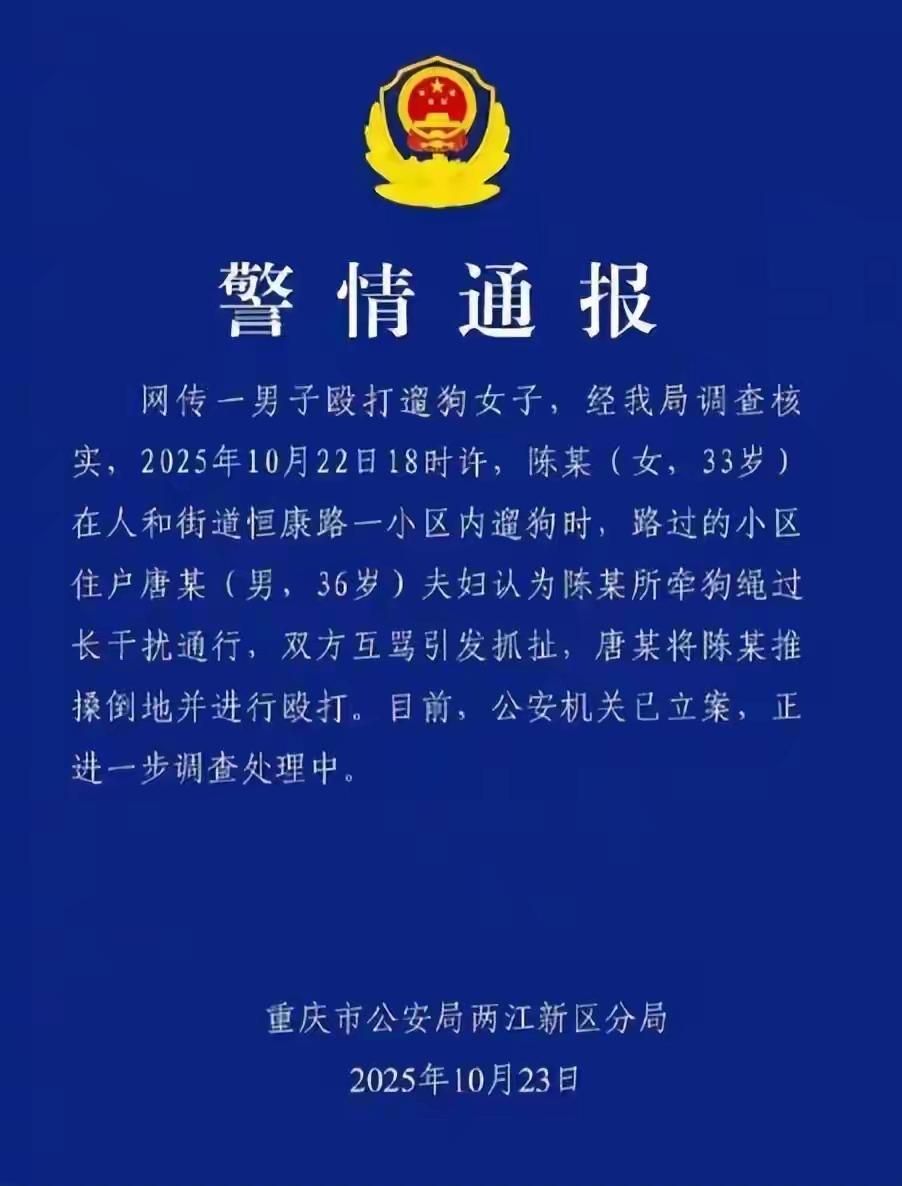 警方介入调查 有话好好说,男子殴打遛狗女子,说明男子性格不好,脾气暴躁,控制不住自己的情绪,动手打人是不对的。 事发于重庆市渝北区人和街道某小区,10月22日18时许,住户陈女士在小区遛狗。过路的唐某夫妻俩嫌陈女士牵狗绳太长,影响过路,双方互骂引起抓扯,警方已经立案调查。 我认为男子唐某要负主要责任。陈女士在小区遛狗,遛狗绳过长的原因,可能当时周围没人,为让狗儿活动范围大些,就把遛狗绳放长,没想到却突然出现唐某夫妻俩。 现在,城里人养宠物狗的比较多,在小区里遇到遛狗的现象比较常见。居住在同一个小区,都是邻居,要经常碰面,要以“和”为贵,遇到这种狗情况,都是主动避让。 唐某夫妻俩遇到陈女士遛狗,遛狗绳子可能确实是过长,唐某夫妻俩可以绕开,没有必要发生互骂。 然而,唐某还是嫌陈女士遛狗绳过长,影响夫妻俩过路,责怪陈女士。陈女士受到唐某夫妻发责怪,不服务就反驳 ,双方就互骂。男子唐某控制不住愤怒的情绪,就动手殴打陈女士,把陈女士打伤住院。 本来是一件小事情,唐某夫妻俩能够谦让一下,就过去了,可是却因唐某控制不住愤怒的情绪,动手殴打陈女士,性质严重了,既要赔偿陈女士的医疗费,又要接受警方的处理,不值得。朋友们你们同意我的说法吗?(图片来源于网络)殴打事件 殴打伤人 女子打人