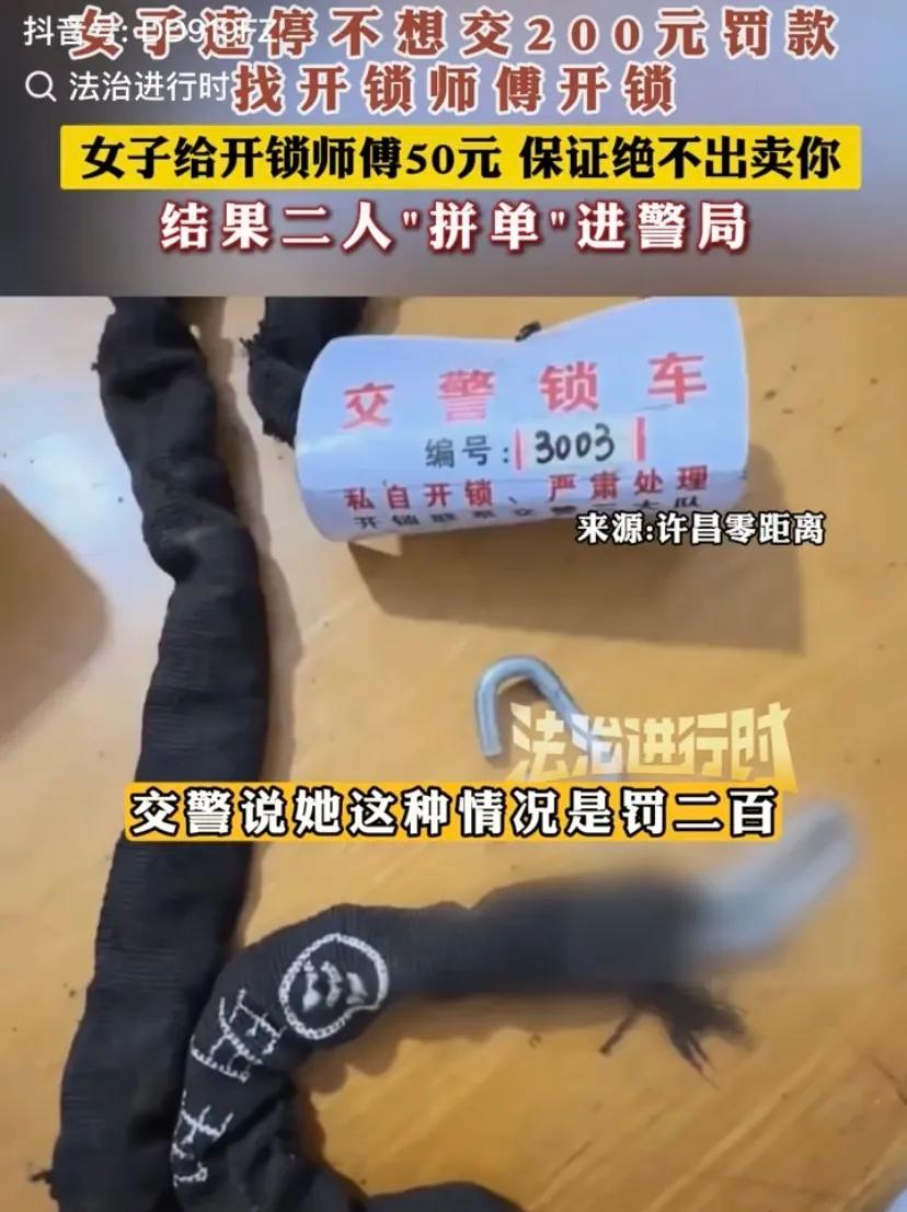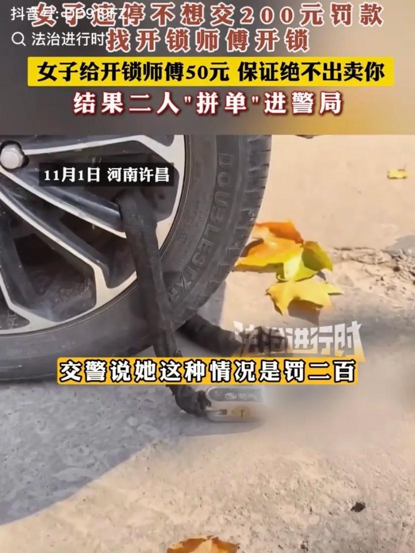 “锁能开,法锁不开!”河南许昌,女子违停被交警依法加锁,正常缴200元就能放行,她却嫌“冤枉钱”,花50块找开锁师傅私拆,还拍胸脯保证“绝不出卖”。结果交警巡查发现,两人一起被带走。网友冷评:省150,换一副银手镯,值吗? 女子回车发现前轮被黄色锁具卡住,拨打交警电话得知需去窗口缴200元罚单,她嘴里答应,转身却上网搜“技术开锁”。 五十分钟后,开锁师傅拎着工具箱赶到,锁身明明贴着“执法专用,私拆违法”红字,他却听女子一句“我担责”,钻头一别,“咔哒”一声锁落地。 两人正一手交钱一手交货,巡逻交警已把执法仪对准车牌:锁头编号对不上,女子支支吾吾,师傅想收摊,被一并带回派出所。 笔录室里,女子仍算经济账:200变50,省了150;民警给她添上另一笔:擅自拆执法锁,妨碍公务,行政拘留5日,罚款500;开锁师傅也被立案,营业执照面临暂扣。 事后交警提醒,违停可罚,私拆必拘,锁匠若分不清“客户”与“执法”,手艺就会变手铐;群众更别动“省小钱”的脑筋,规则面前,没有暗门。 对于这件事情,大家有什么看法?