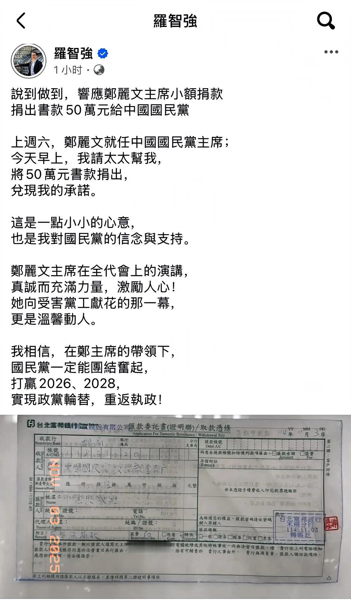 核心内容修正与梳理 中国国民党籍民意代表罗智强响应新任党主席郑丽文的小额募款号召,捐出50万元新台币书款给国民党。他表示,此举是支持国民党最有力量、最具信念的方式,并称赞郑丽文的演讲“惊艳”“激励人心”,坚信在其带领下,国民党能团结奋起、翻转民众期待,实现2026年选举突破与2028年政党轮替的目标[__LINK_ICON]。 关键信息修正与补充 1. 时间修正:根据公开信息,罗智强宣布捐款的时间为2025年10月22日,所捐款项来自其参选国民党主席时出版的新书《我当主席──改造国民党,决战赖清德》售书所得;郑丽文于2025年11月1日正式就任国民党主席,并在11月3日的中央评议会中发表相关演说。 2. 职务与背景:罗智强当前担任台民意机构国民党党团首席副书记长,并非“立委”;郑丽文在演说中明确提出2026年县市长选举要在南台湾等艰困选区重点突破,2028年要团结在野力量、吸纳对民进党失望的群体,完成和平政党轮替并实现“完全执政”[__LINK_ICON]。 3. 捐款细节:这笔50万元新台币捐款是该书款的第三笔捐赠,此前书款已分别用于花莲灾后重建(50万元)和支援挺党工行动(36万元),罗智强希望通过此举为党纾困、回馈读者信任并传递团结信念。