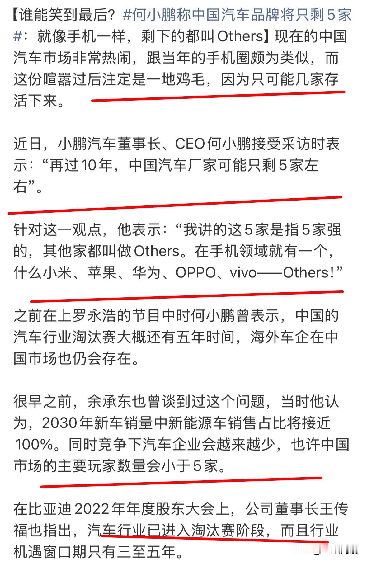 近日,小鹏汽车CEO何小鹏接受采访时表示:“再过10年,中国汽车厂家可能只剩5家左右”。 针对这一观点,他表示:“我讲的这5家是指5家强的,其他家都叫做Others。在手机领域就有一个,什么小米、苹果、华为、OPPO、vivo——Others!” 之前在上罗永浩的节目中时何小鹏曾表示,中国的汽车行业淘汰赛大概还有五年时间,海外车企在中国市场也仍会存在。 很早之前,余承东也曾谈到过这个问题,当时他认为,2030年新车销量中新能源车销售占比将接近100%。同时竞争下汽车企业会越来越少,也许中国市场的主要玩家数量会小于5家。 现在的车市早就不是“随便造辆车就能卖”的年代了,数据藏着最狠的真相。2025年前三季度,销量前十的车企集团占了84.7%的市场份额,头部品牌研发投入占比超营收10%,比亚迪半年研发费就砸了202亿,而很多二三线品牌研发占比不足5%,技术代差越拉越大。更现实的是,现在主流品牌月度交付门槛已经到4万辆,卖不到这个数的,生产成本和研发成本都降不下来,卷性价比都没资格。 何小鹏敢说这话,其实是看透了行业的“生存密码”。现在造车早不是单打独斗能成的,小鹏今年光自动驾驶研发就花了42亿,小米建电池工厂砸了100亿,没有持续的真金白银投入根本站不住脚。而且供应链得抱团才有话语权,去年小鹏和小米合并电池订单,才拿到了宁德时代的优惠价和优先供货权,单打独斗连电池都拿不到好资源。那些还在搞内耗、渠道有短板、资源分散的品牌,只会加速被淘汰。 最有意思的是,何小鹏说“要是只剩5家,更愿意身边是小米这样的兄弟公司”。这哪是讲情怀,分明是行业潜规则——现在新势力最大的威胁不是彼此,是大众、丰田、BBA这些传统巨头的电动化反扑。就像当年手机圈华为、小米从互撕到抱团,现在车圈也得省下内耗的钱,才能跟特斯拉拼技术。 对咱们普通消费者来说,这反而是好事。车企不内耗,才会把钱花在真升级上:小鹏加了激光雷达不涨价,小米直接标配5C超充,服务网络也开始互通。而且选头部品牌更靠谱,比亚迪光售后网点就超2800家,配件48小时内就能到,小众品牌可能连维修配件都要等好几个月。 现在再看那些月销几千台、研发没动静的品牌,确实很难撑过这轮洗牌。何小鹏和余承东的预判,其实是给所有车企敲了警钟:要么拼技术、抱大腿、建壁垒,要么就等着变“Others”。