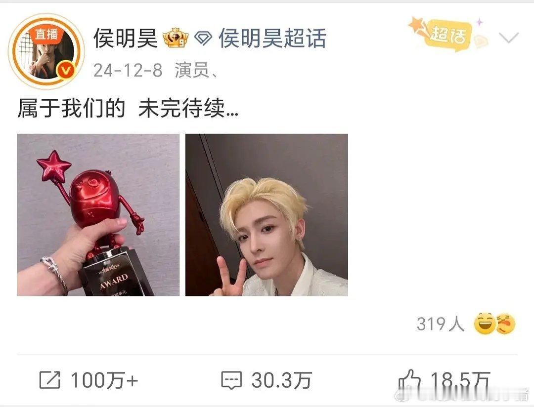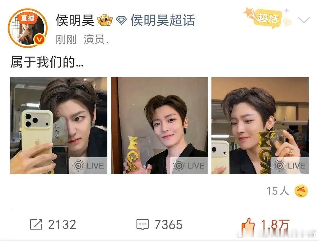 侯明昊领奖都会发进粉丝超话,属于我们的,第一个开始,未完待续[捂嘴哭][捂嘴哭]