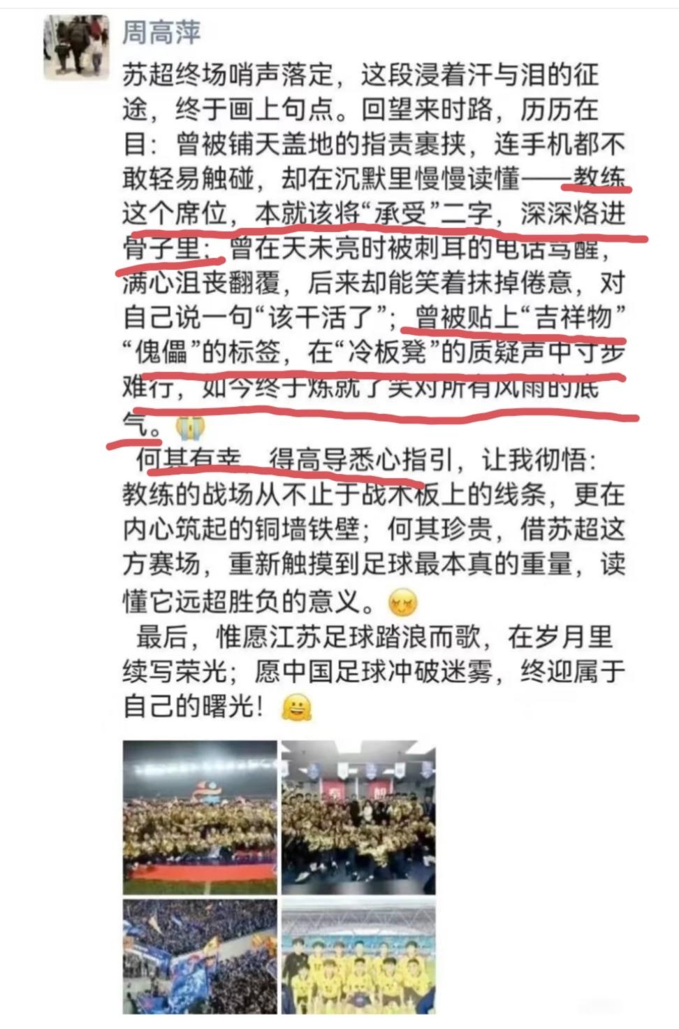泰州队主教练周高萍赛后发文! 周教练文中的这几段话,让人印象深刻: 教练这个席位,本就该将“承受”二字,深深烙进骨子里。 曾被贴上“吉祥物”、“傀儡”的标签,在“冷板凳”的质疑声中寸步难行。 …… 网友吐槽:这哪里是一位冠军教头分享获奖后的喜悦之情啊,分明是在大倒苦水吗!我敢打包票,这位周教头明年肯定跟泰州队分道扬镳了,甚至可以说已经跟苏超在说再见了! 评论区的网友们,你们觉得呢?